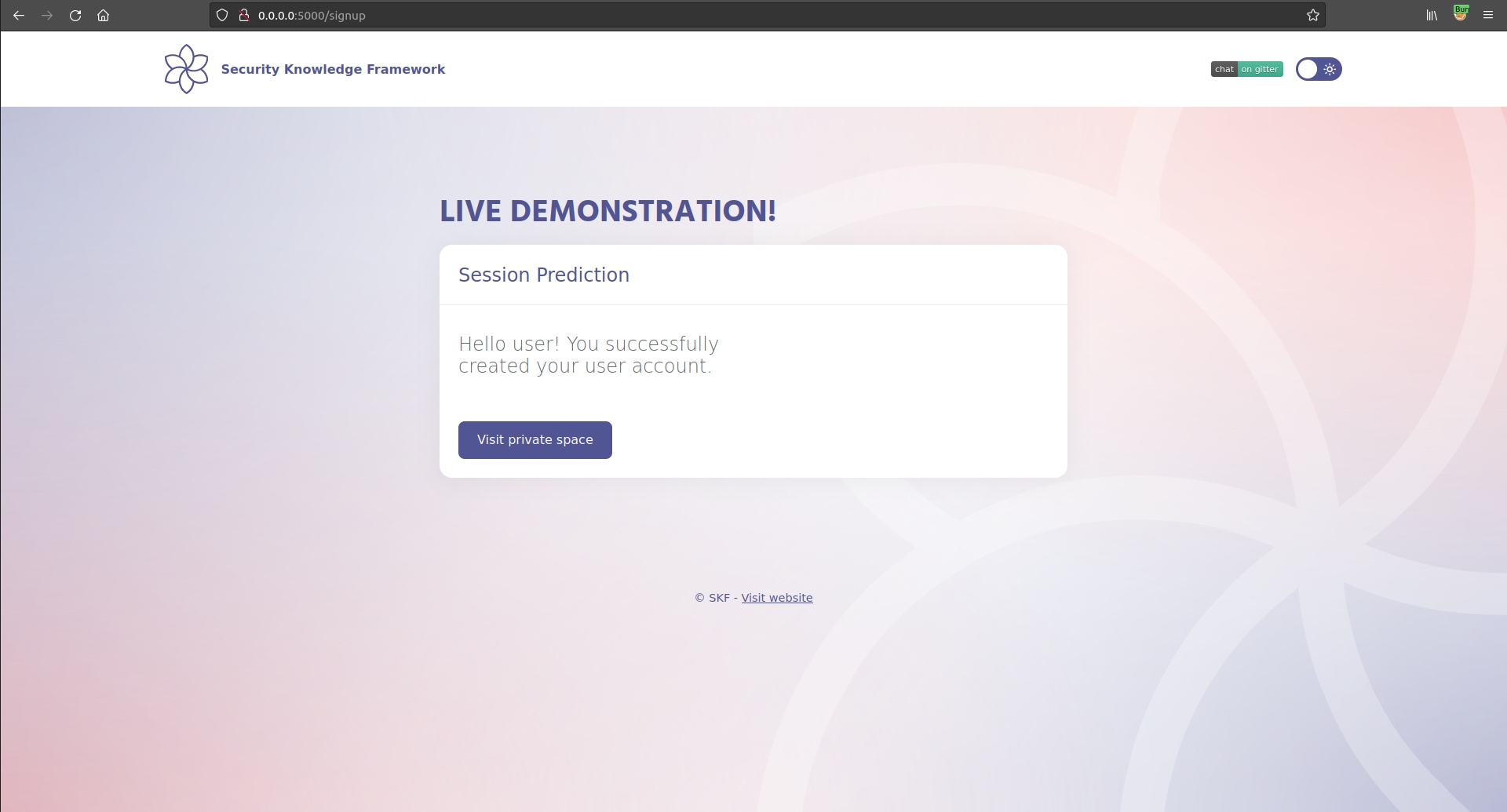 $ sudo docker run -ti -p 127.0.0.1:5000:5000 blabla1337/owasp-skf-lab:java-auth-bypass3