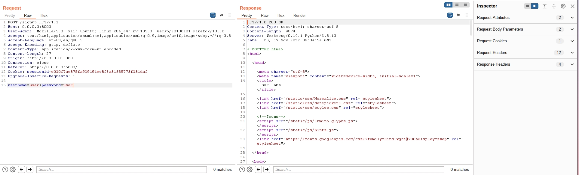 If we inspect the request with an intercepting proxy (we are using Burp) we can see that the application is performing a POST request to /signup: