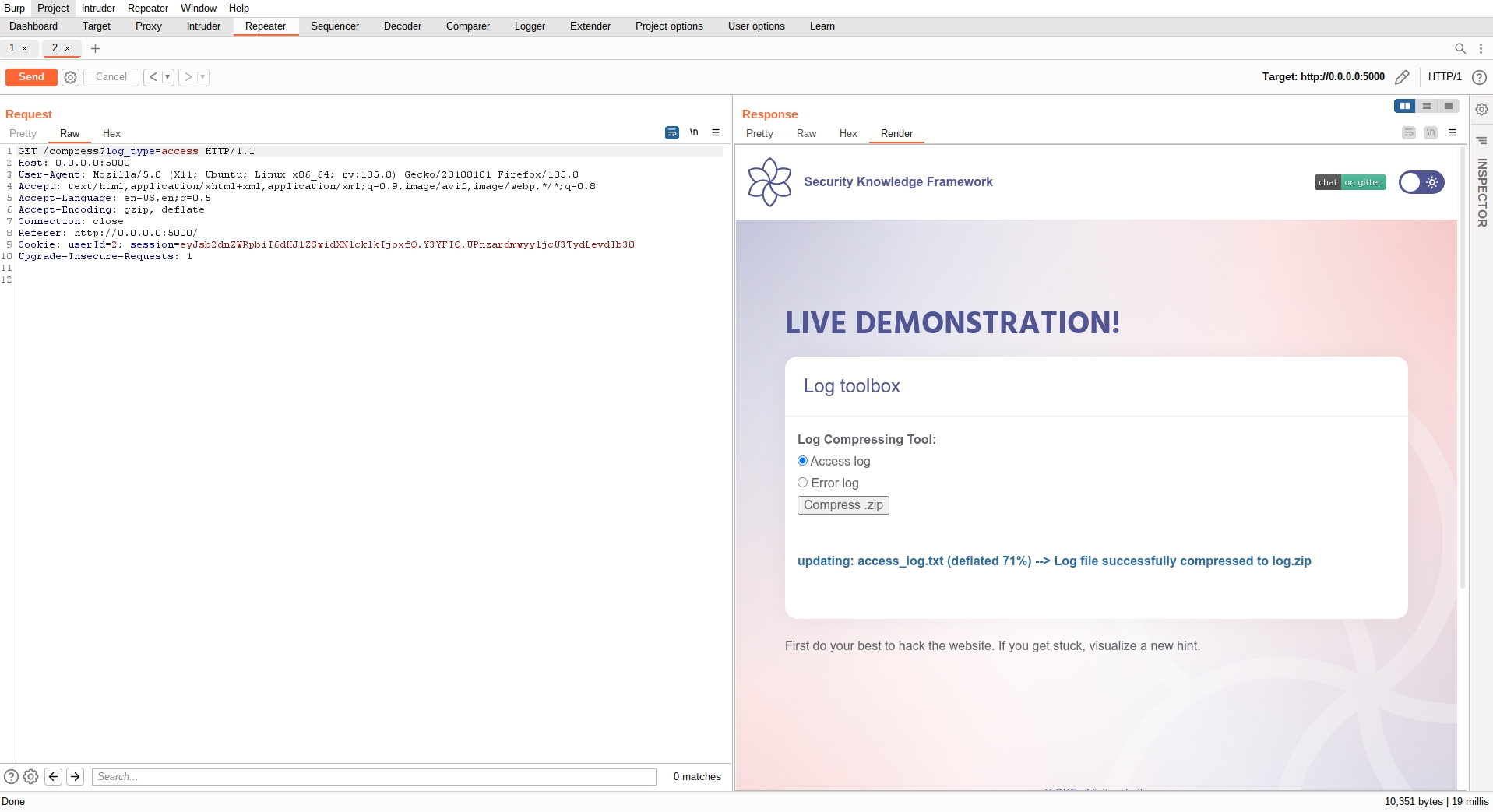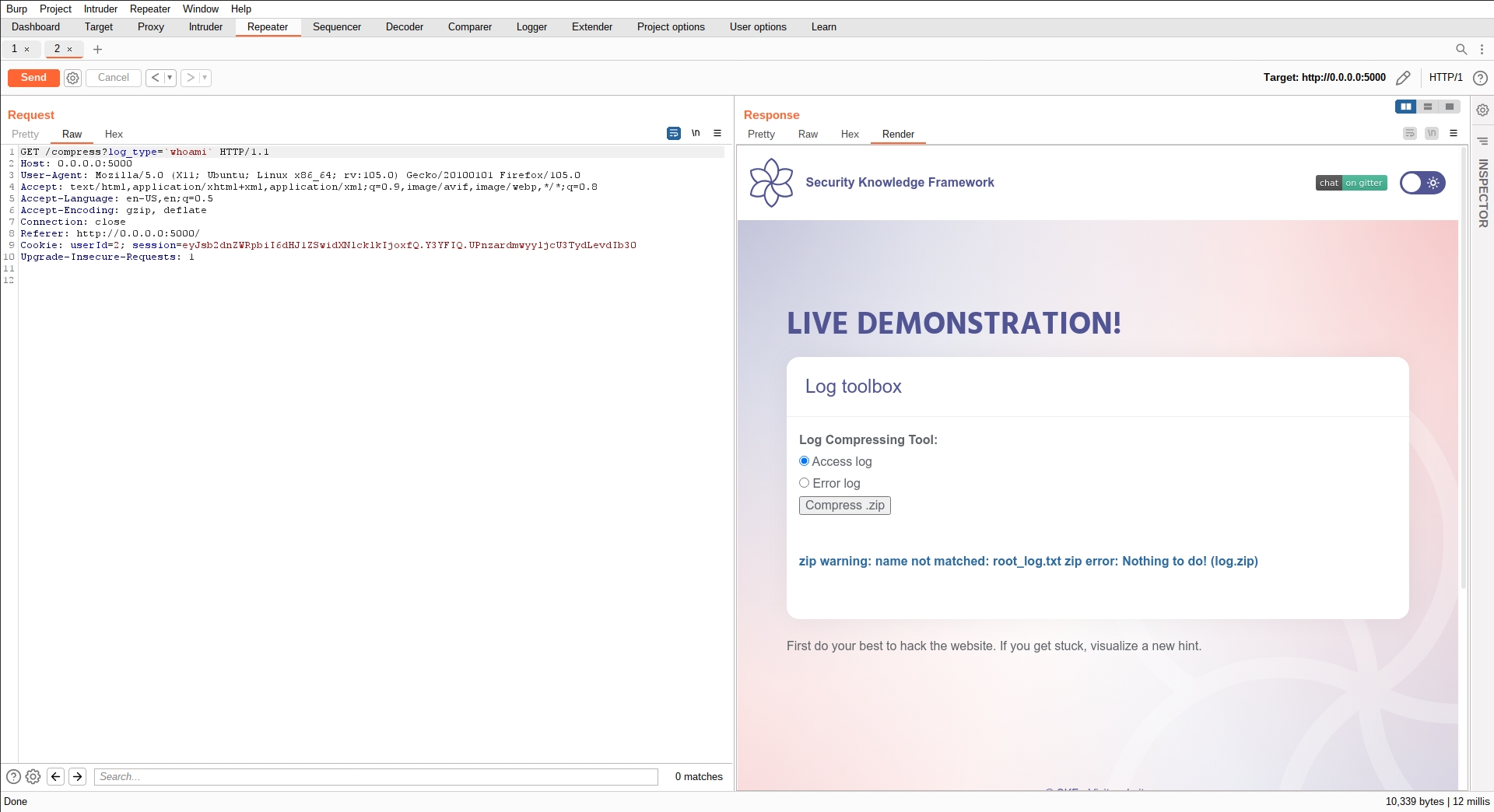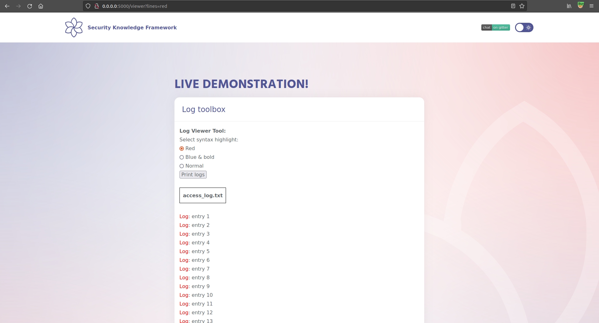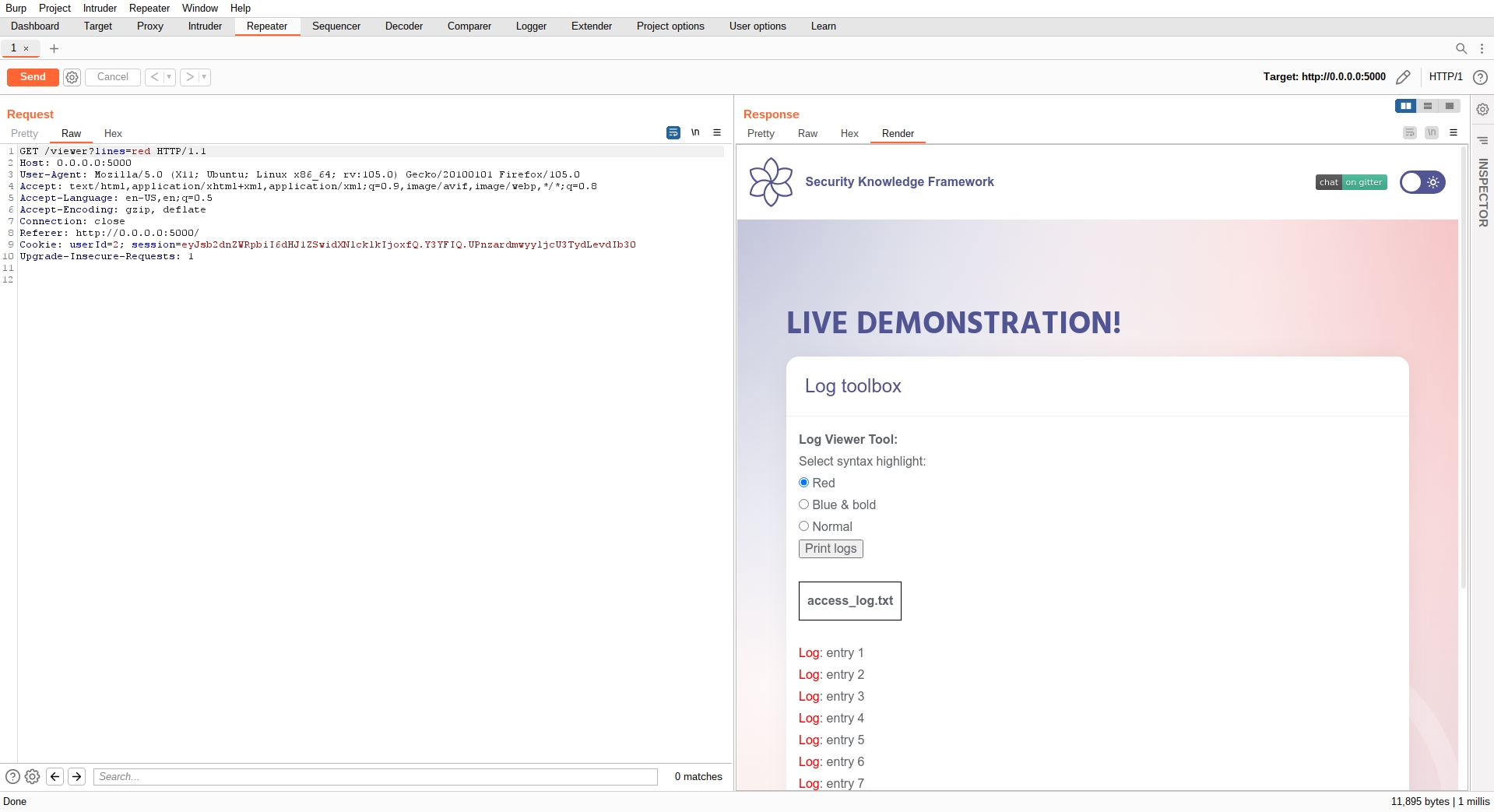 If we select the red color, the word log for the logs, will be red. We can inspect the request with an intercepting proxy (we are using Burp):