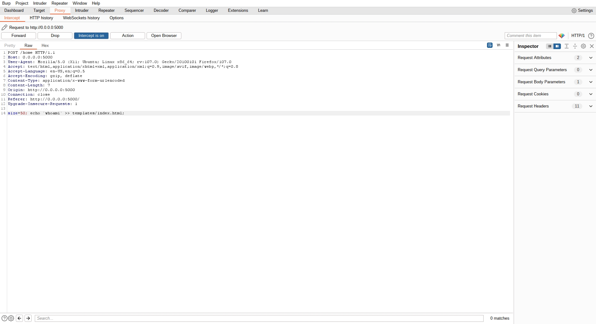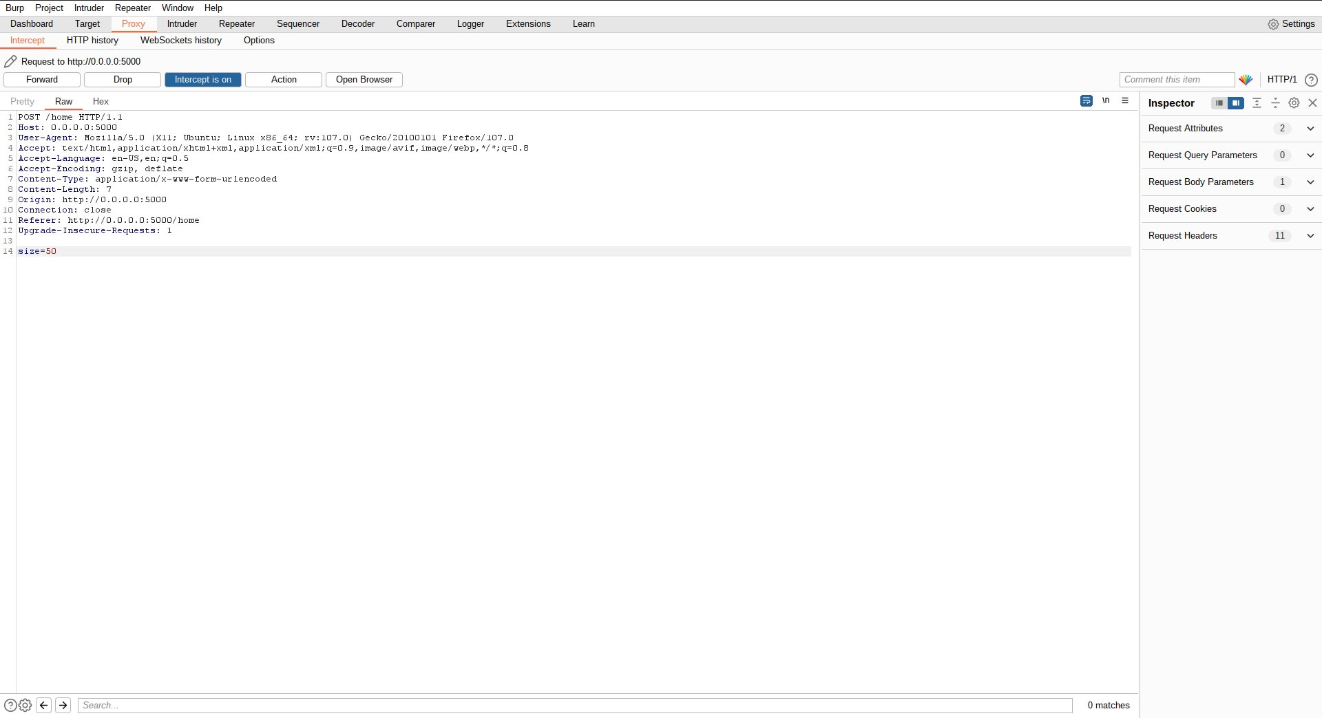 If we inspect the request with an intercepting proxy (we are using Burp) we can see that the application is performing a POST request to /home. In the request we send the number (in percentage) to resize the image. In the response, we can check that the image has been resized.