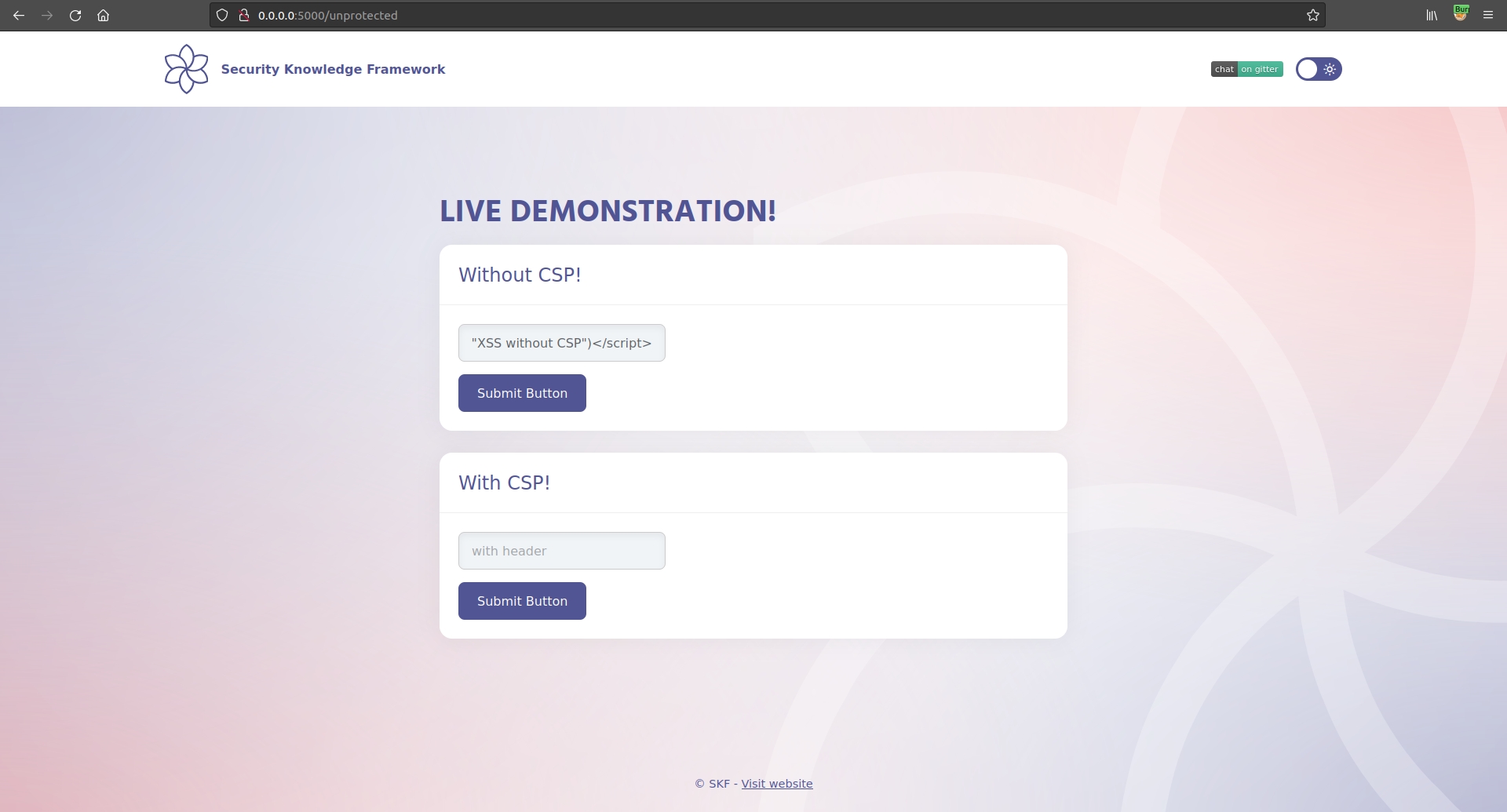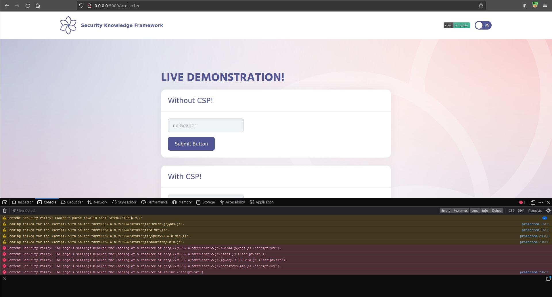 $ sudo docker run -ti -p 127.0.0.1:5000:5000 blabla1337/owasp-skf-lab:js-csp