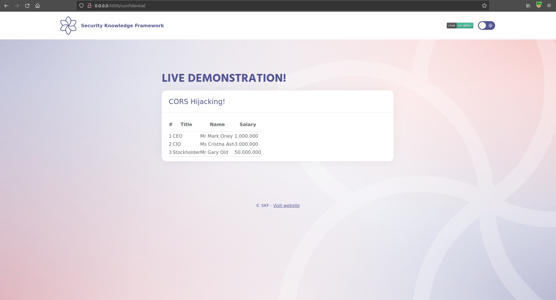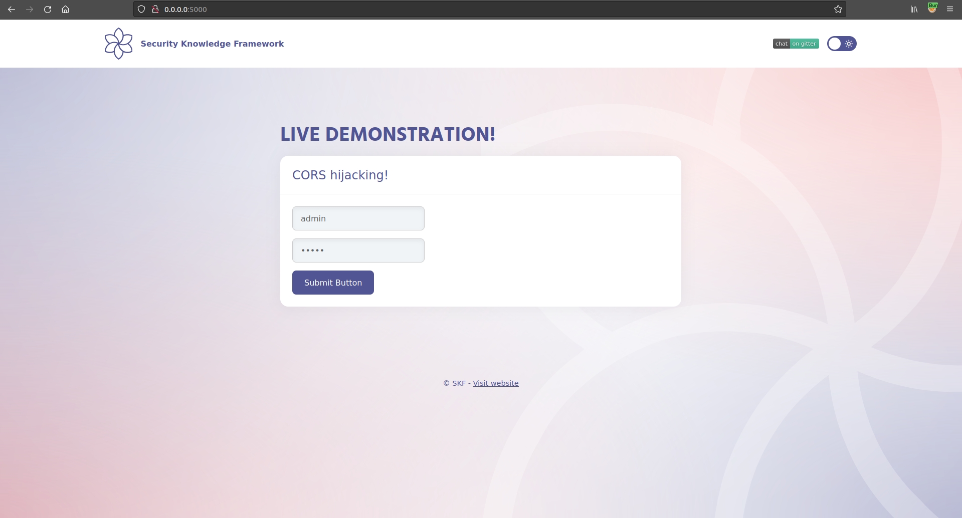 $ sudo docker run -ti -p 127.0.0.1:5000:5000 blabla1337/owasp-skf-lab:cors