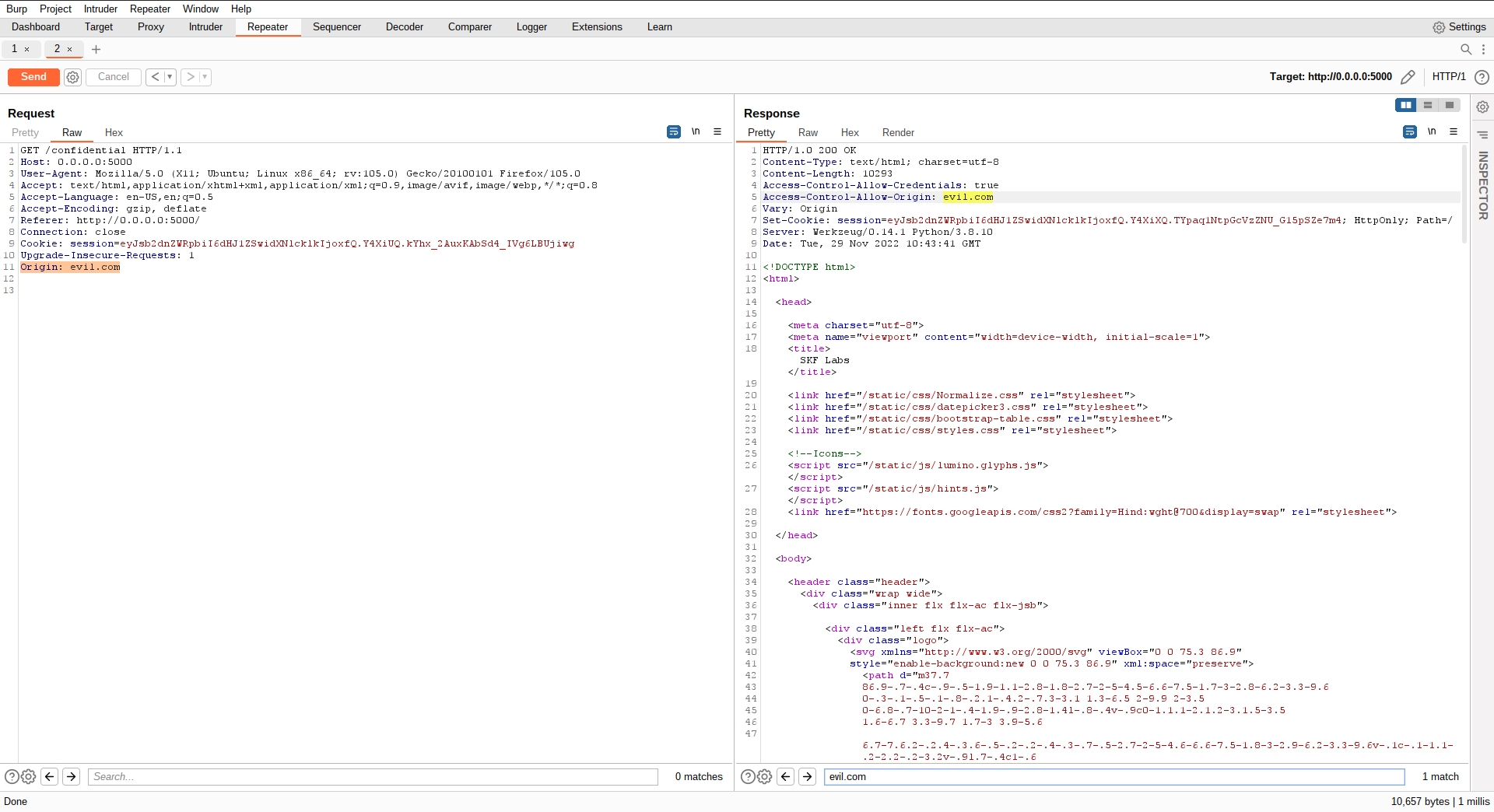 In this request we find the "Origin" header appended to the request from source "http://0.0.0.0:1337" as to be expected. It is now good to note when we remove this header from the request the attack is no longer working.
