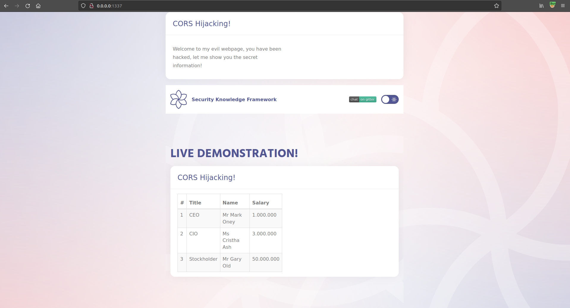 The rest of the attack wil look kind of similar to a CSRF attack. However, instead of doing a state changing operation on behalf of the targeted user, we will now do a XHR GET request from our evil domain in order to steal sensitive information.