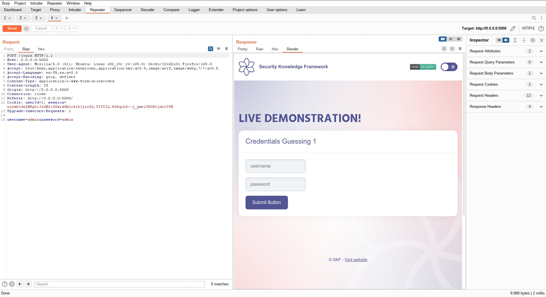 $ sudo docker run -ti -p 127.0.0.1:5000:5000 blabla1337/owasp-skf-lab:js-credentials-guessing-1