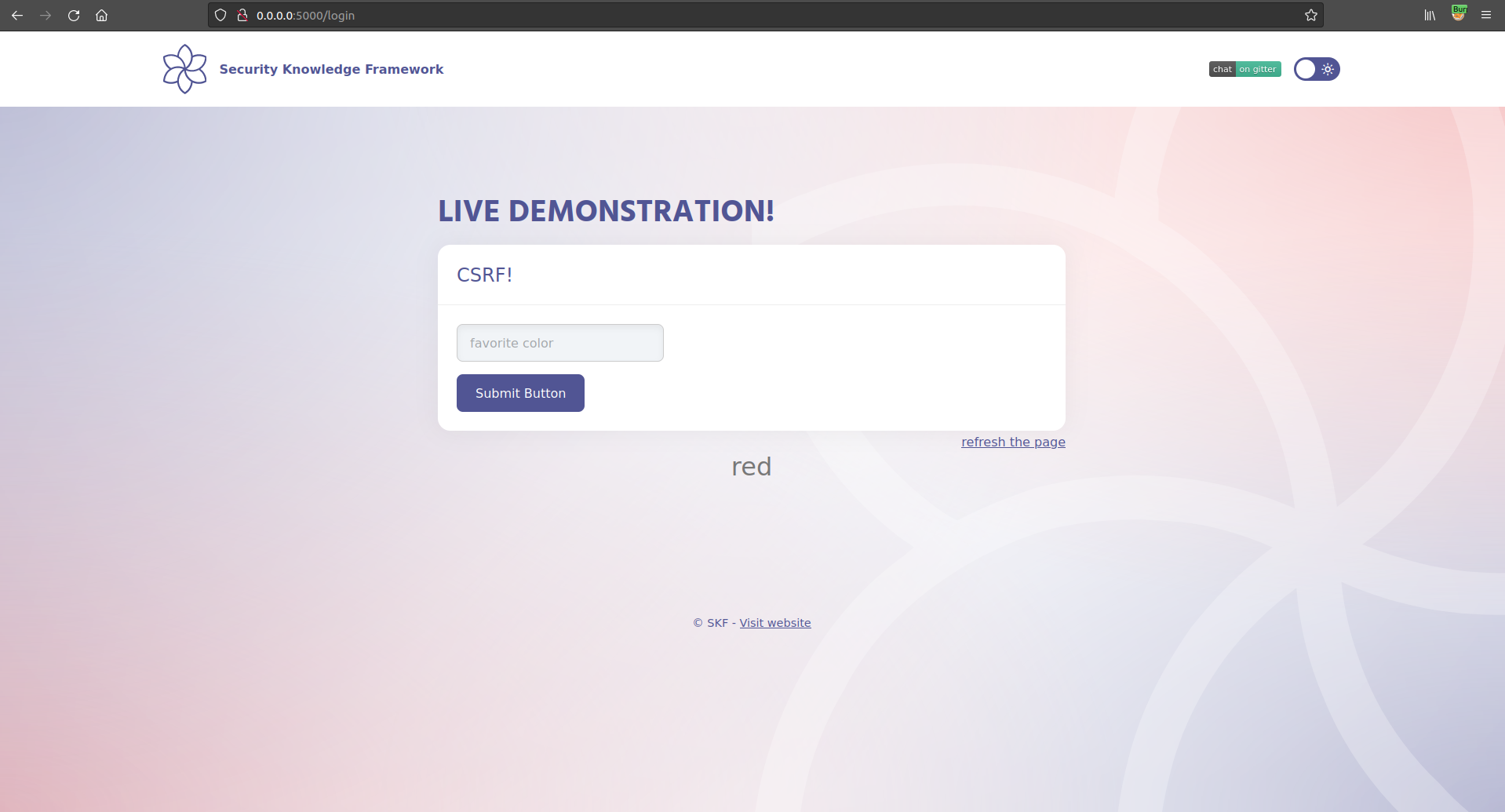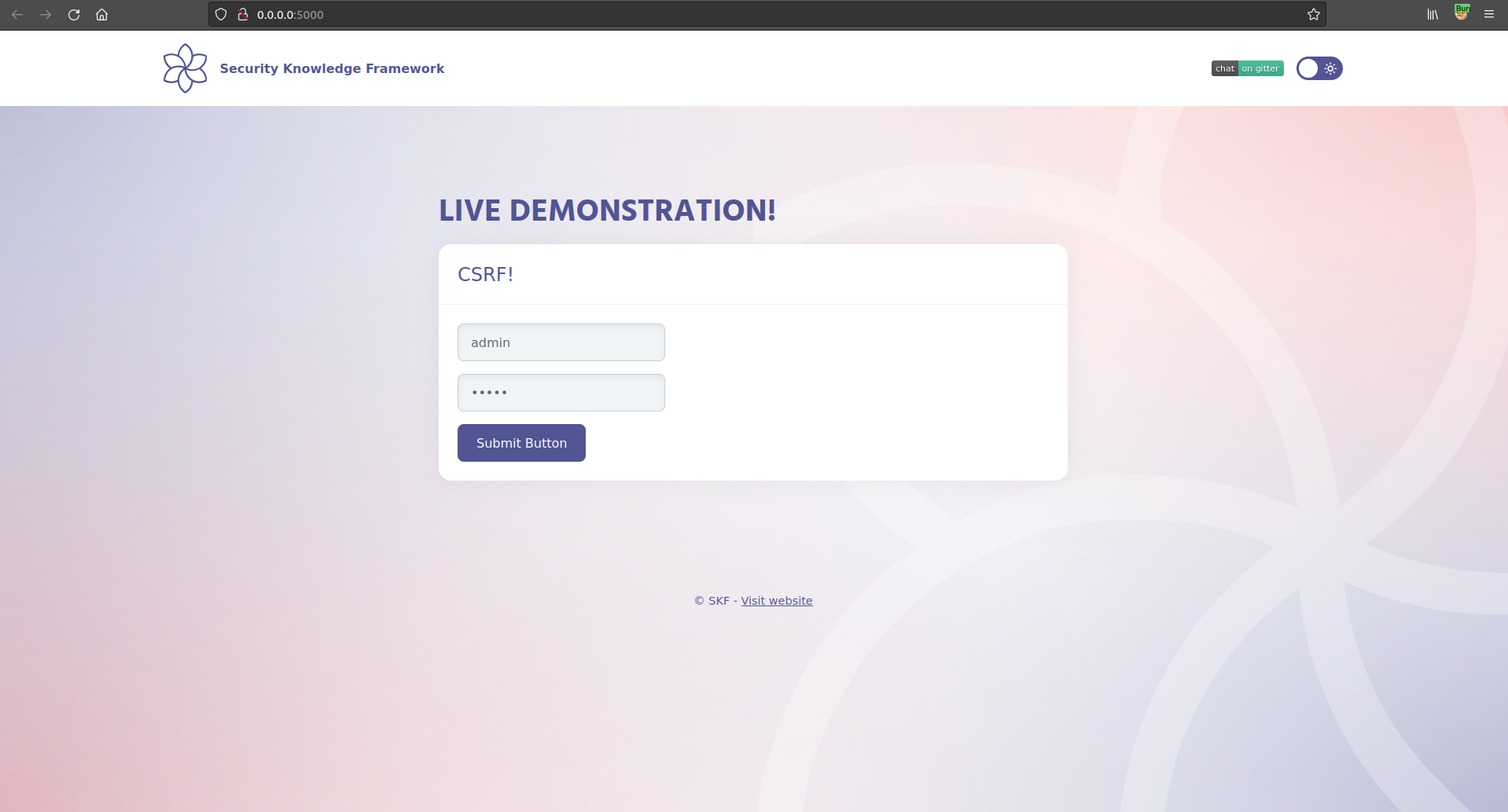 $ sudo docker pull blabla1337/owasp-skf-lab:java-csrf$ sudo docker run -ti -p 127.0.0.1:5000:5000 blabla1337/owasp-skf-lab:java-csrfNow that the app is running let's go hacking!