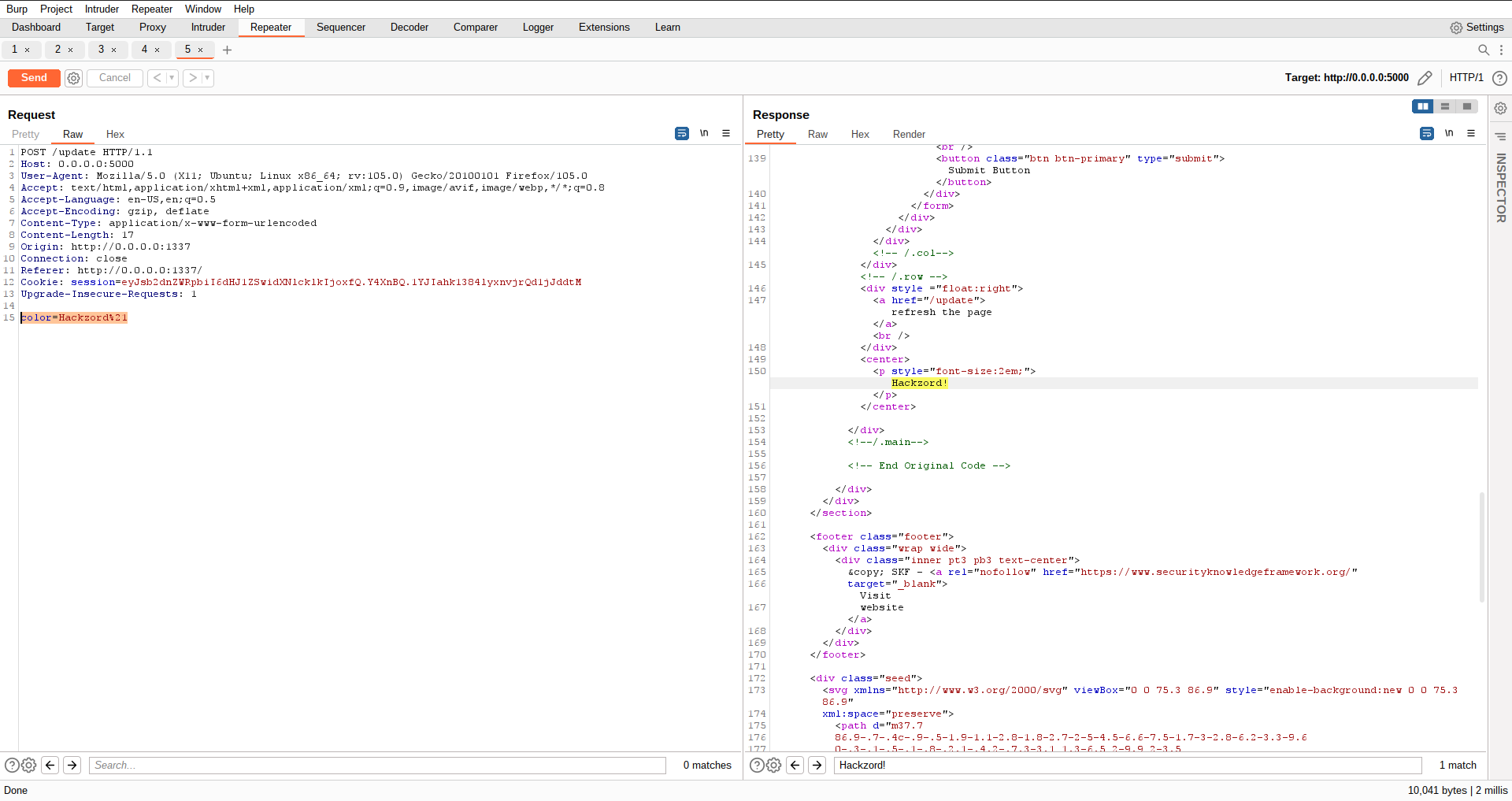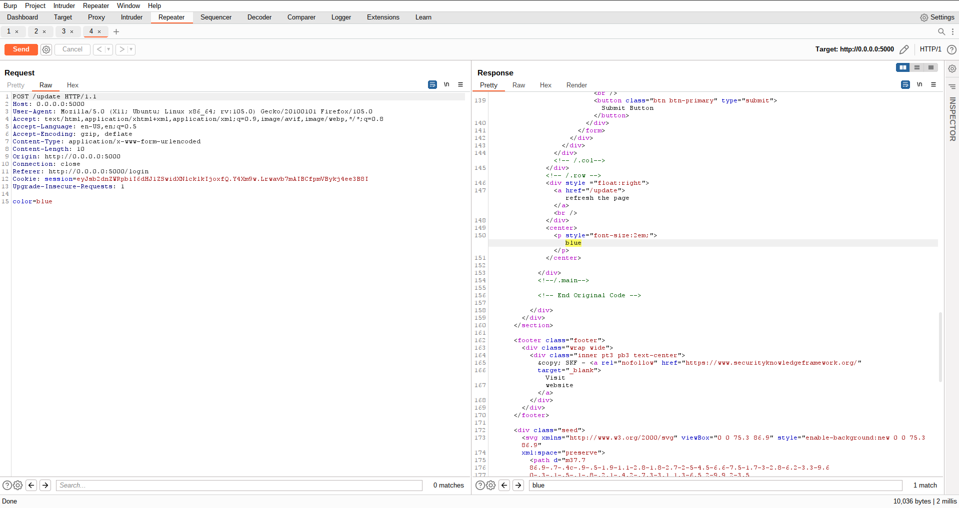 If we inspect the request with an intercepting proxy we can see that the application is performing a POST request that results in a data mutation, storing our favorite color into the session of the user and displaying this back to the user in the HTML website.