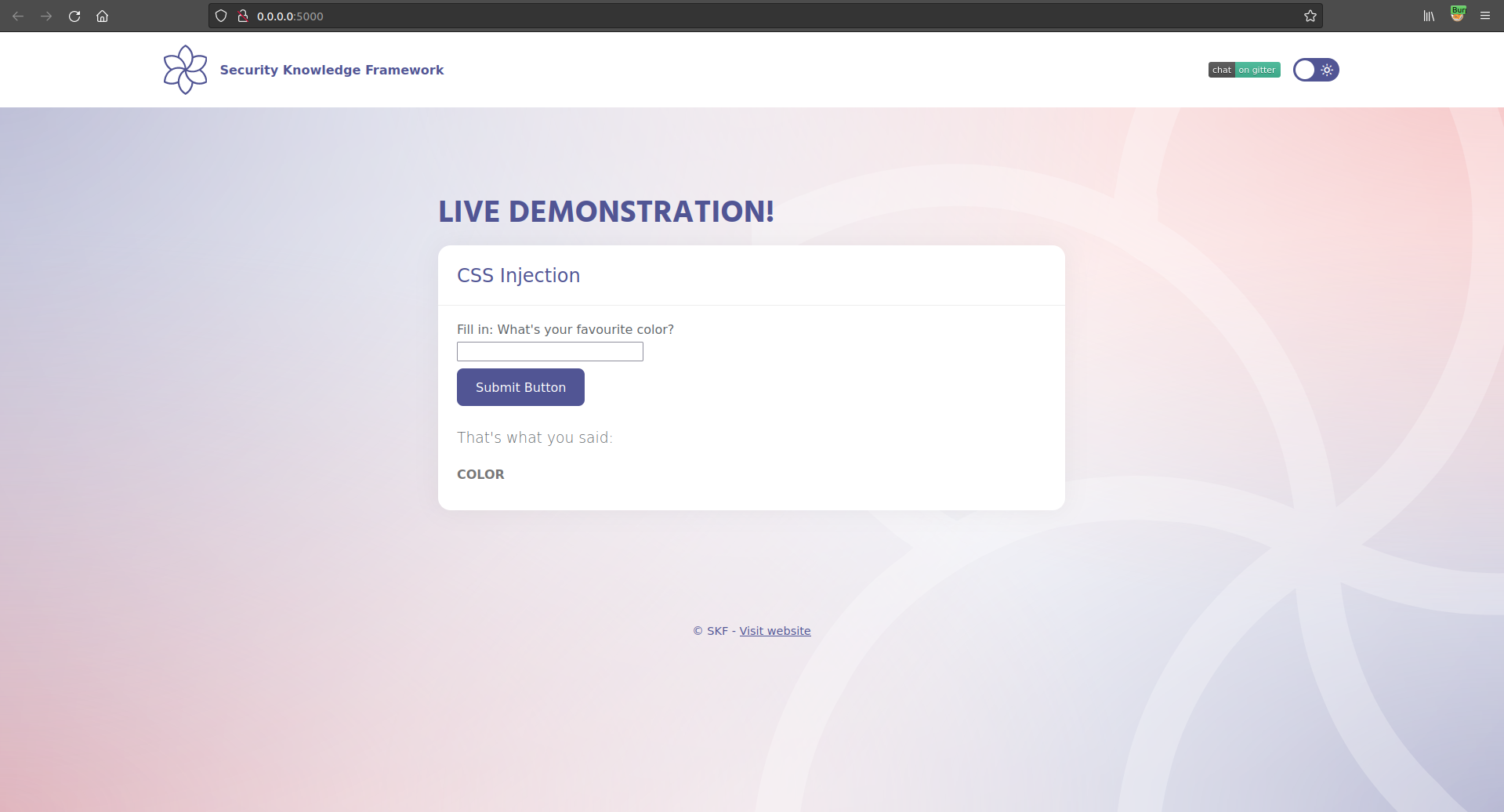 $ sudo docker pull blabla1337/owasp-skf-lab:java-cssi$ sudo docker run -ti -p 127.0.0.1:5000:5000 blabla1337/owasp-skf-lab:java-cssiReconnaissance