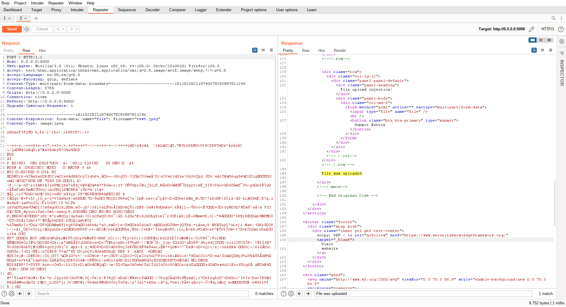 If we inspect the request with an intercepting proxy we can see that the application is performing a POST request that results in a data mutation, storing our file on the server.
