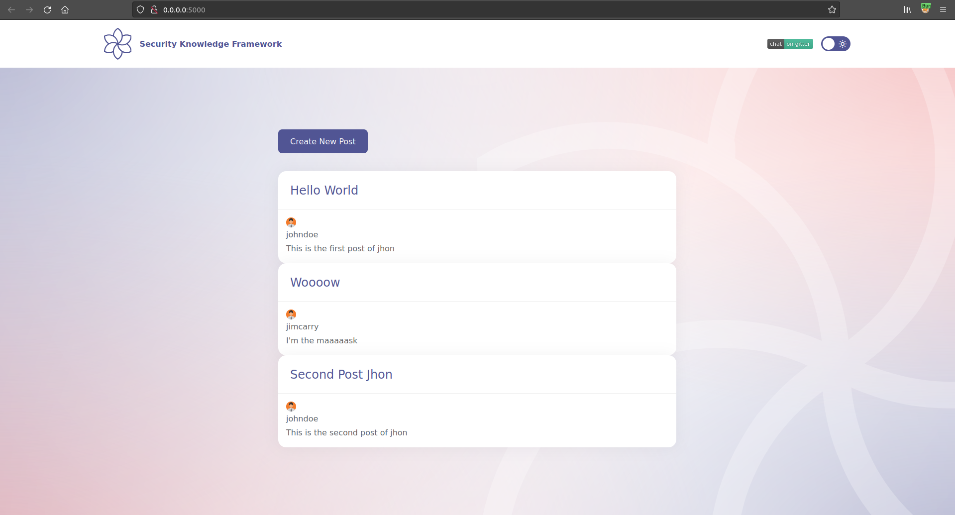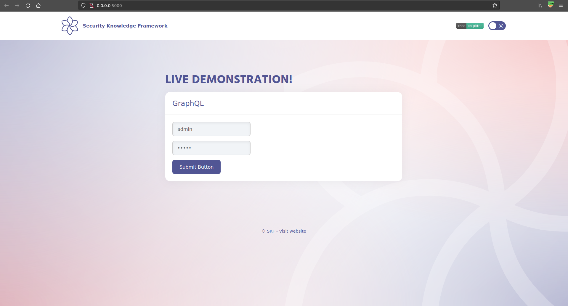 $ sudo docker pull blabla1337/owasp-skf-lab:graphql-injections$ sudo docker run -ti -p 127.0.0.1:5000:5000 blabla1337/owasp-skf-lab:graphql-injectionsNow that the app is running let's go hacking!