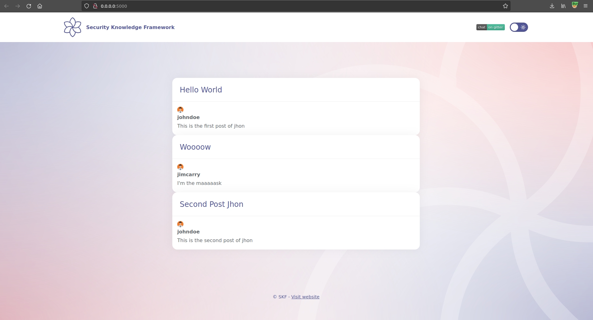 As soon as we browse on http://0.0.0.0:5000 we see the few posts published by 2 users