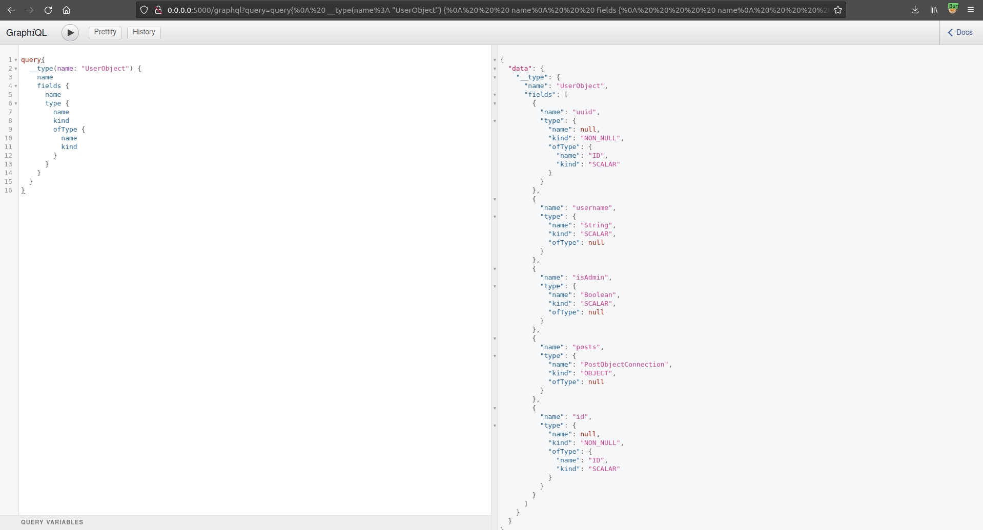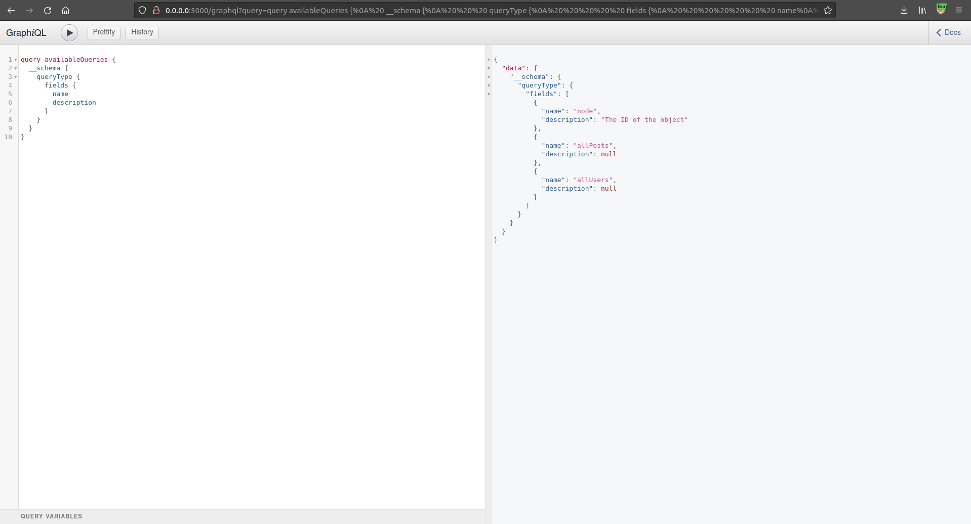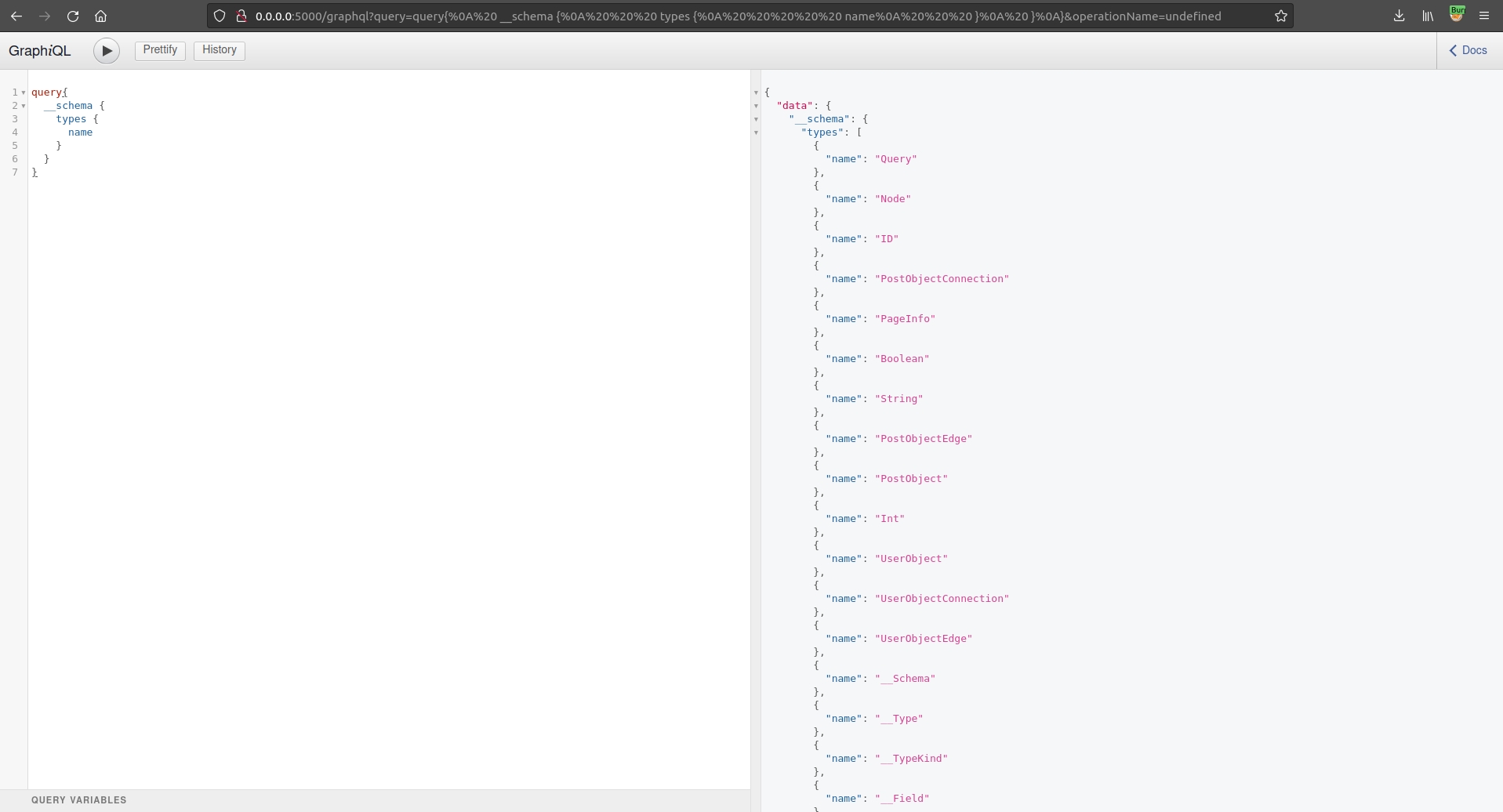 Go to http://0.0.0.0:5000/graphql. We can query the generic __schema using: