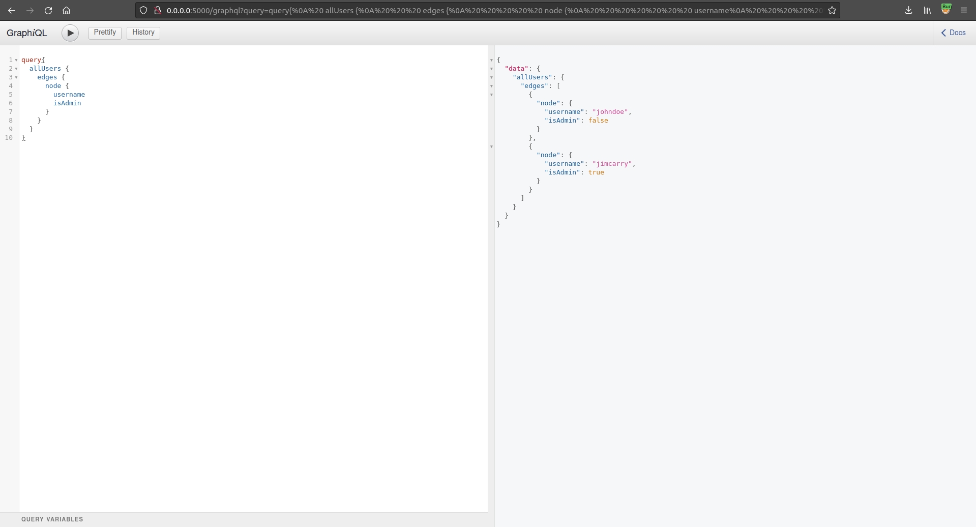 That will give us the allUsers query. Now we need to understand what are the fields. We can do that in different ways, using GraphiQL or doing some more introspection. In this case we use GraphiQL, sending the following query:
