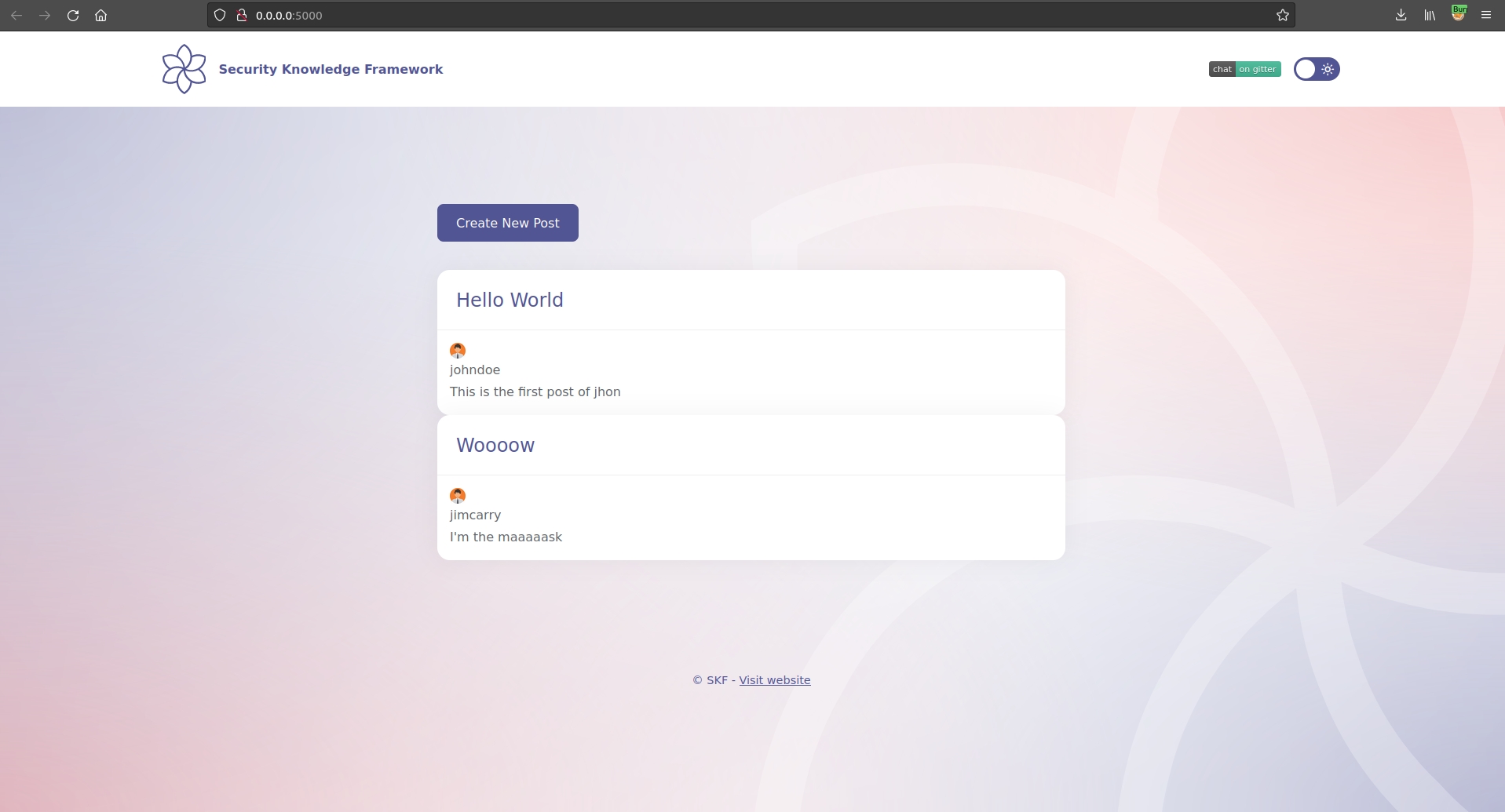 $ sudo docker pull blabla1337/owasp-skf-lab:graphql-mutation$ sudo docker run -ti -p 127.0.0.1:5000:5000 blabla1337/owasp-skf-lab:graphql-mutationNow that the app is running let's go hacking!