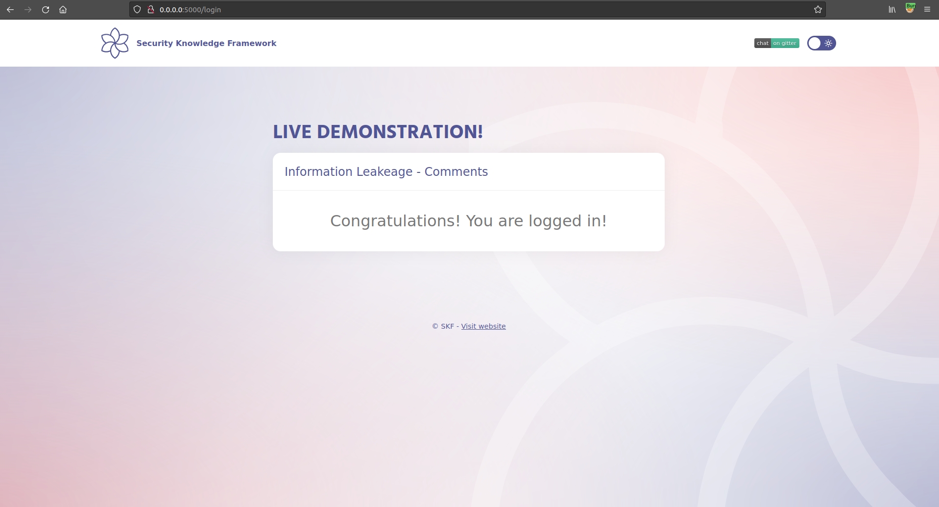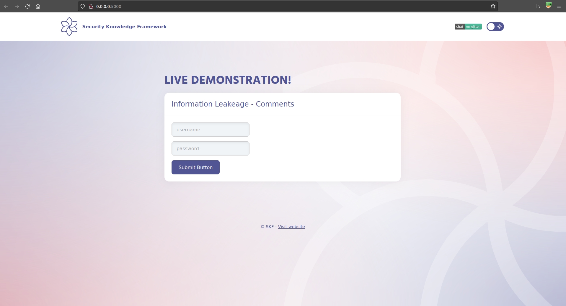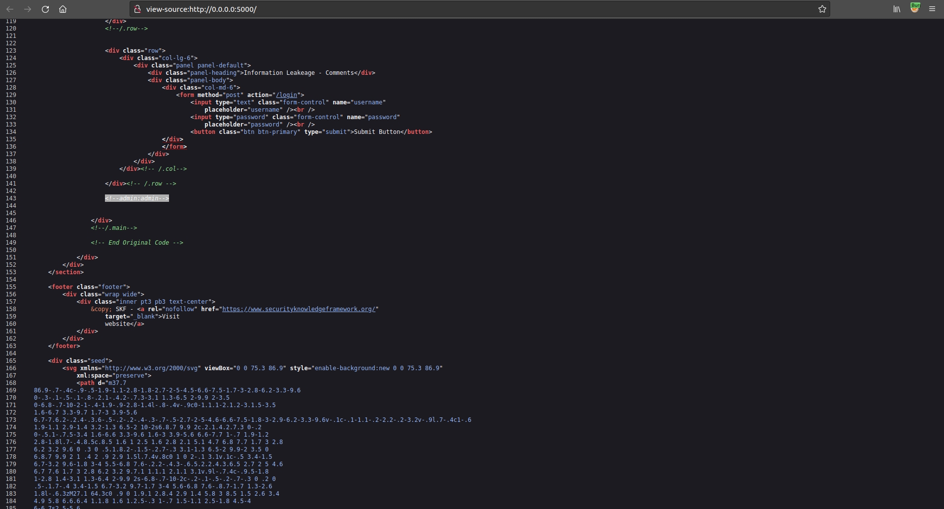 $ sudo docker run -ti -p 127.0.0.1:5000:5000 blabla1337/owasp-skf-lab:js-info-leakage-comments