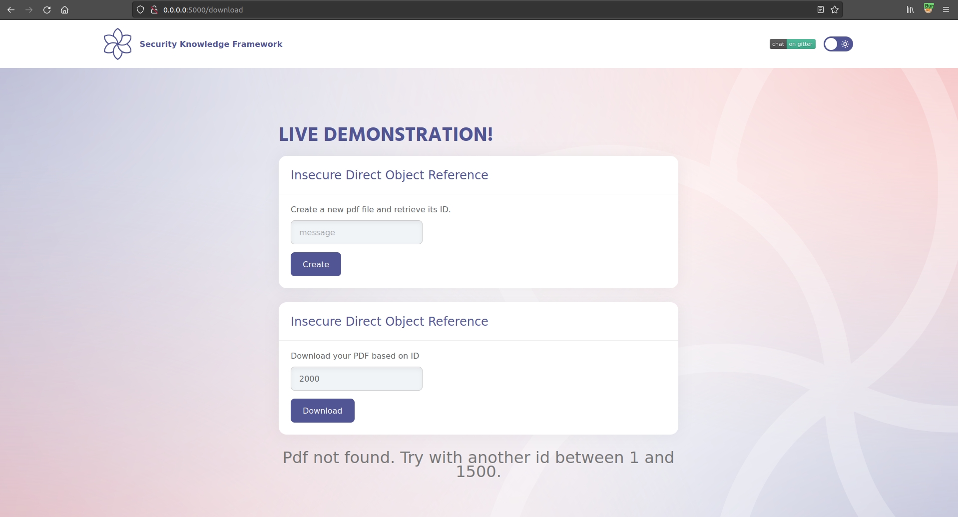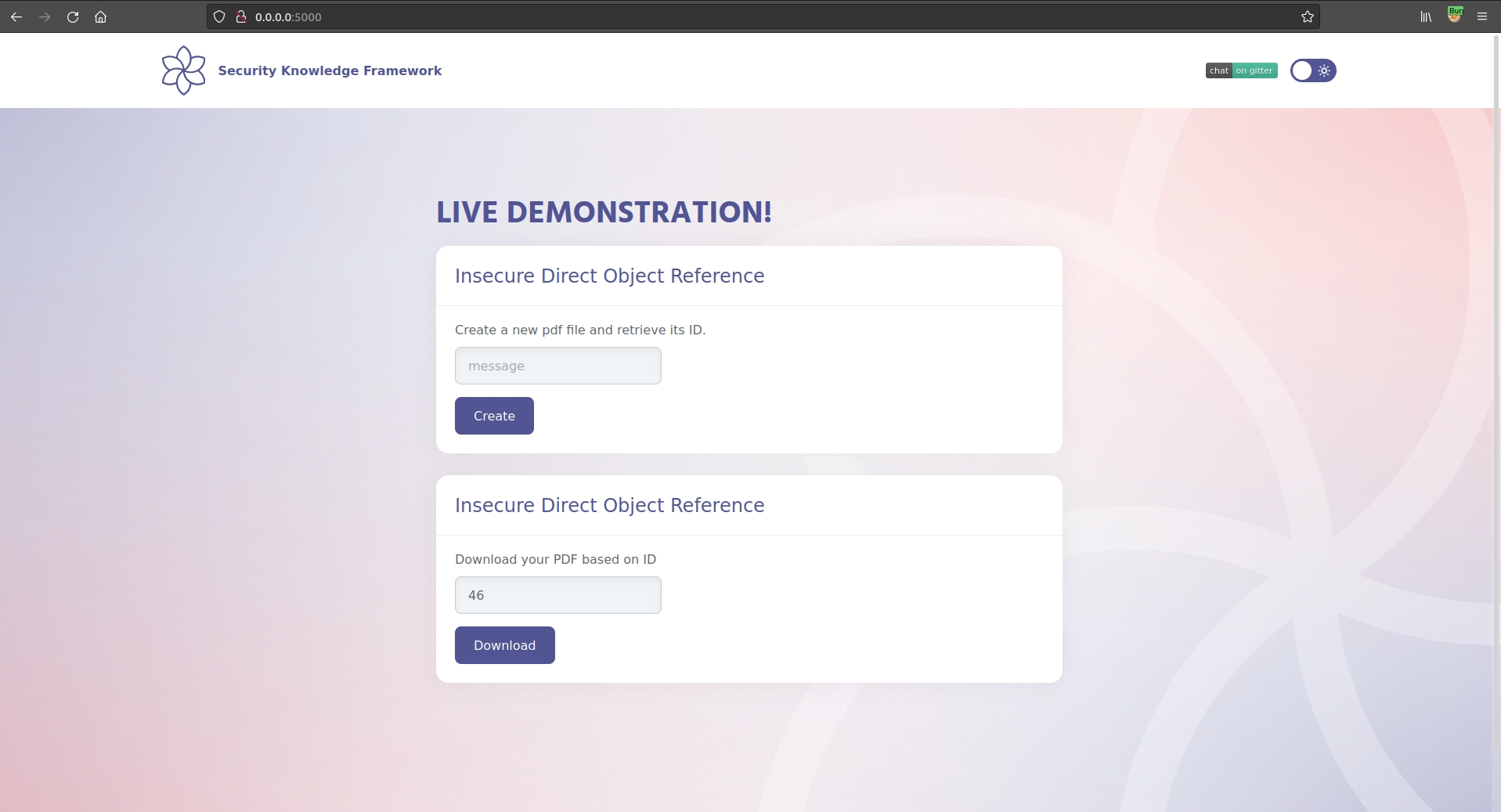 $ sudo docker run -ti -p 127.0.0.1:5000:5000 blabla1337/owasp-skf-lab:idor