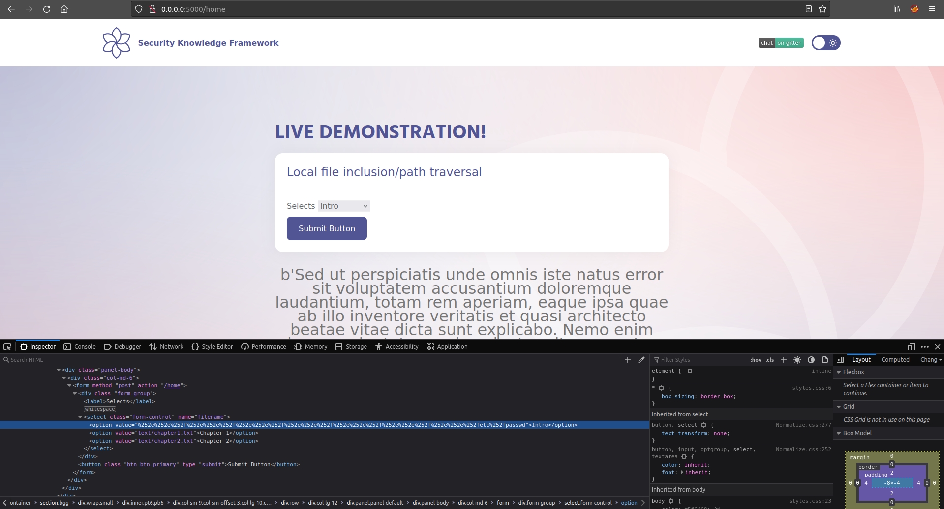 Let us see how can we exploit the file inclusion vulnerability in a real world scenario, the application here allows us to view details on Intro, Chapter1, Chapter2 and so on.
