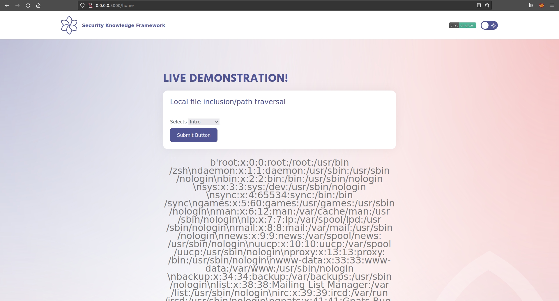 $ sudo docker run -ti -p 127.0.0.1:5000:5000 blabla1337/owasp-skf-lab:js-lfi-3