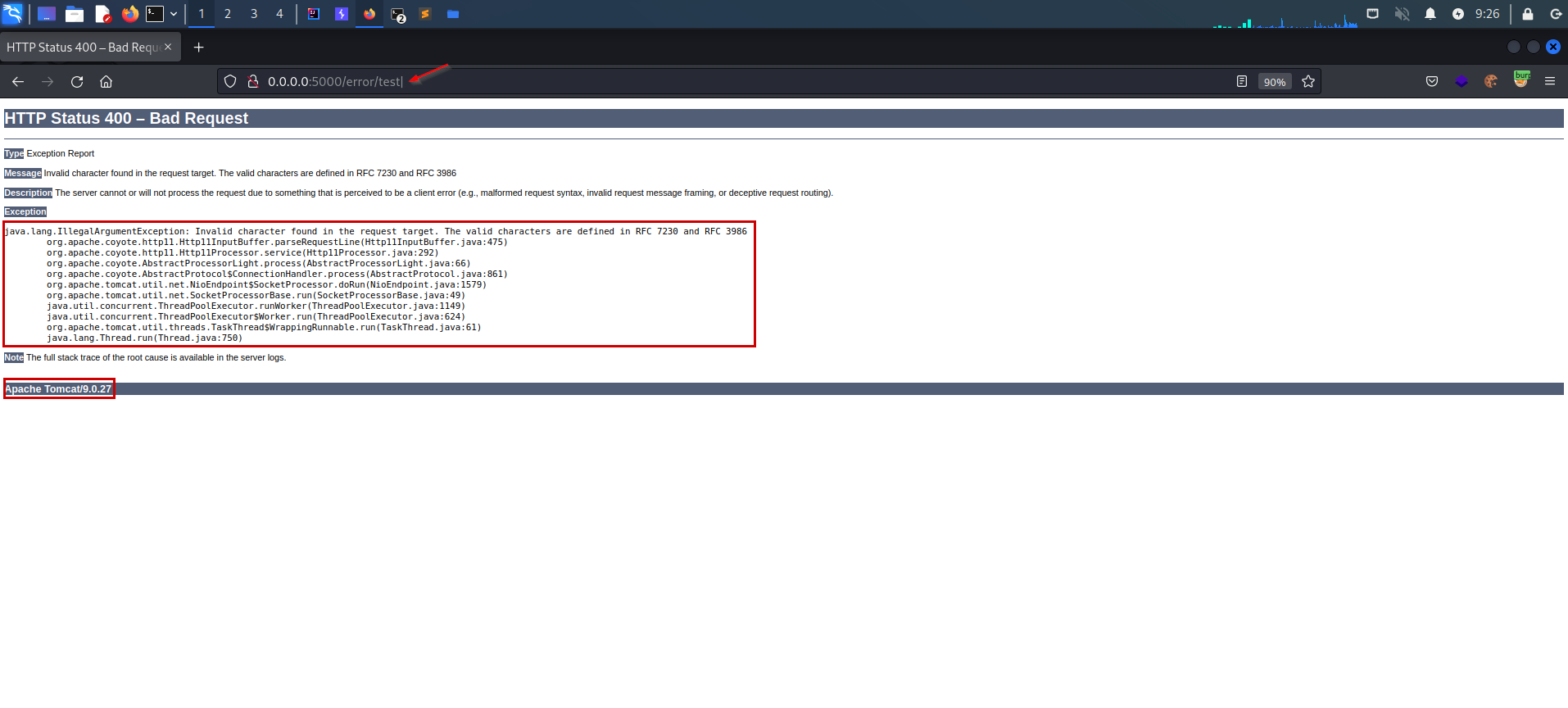 Let's play with URL a bit more to find out more information. In the screenshot below in the response of the error, we find that a Java backend is running, accompanied with the server "Tomcat".