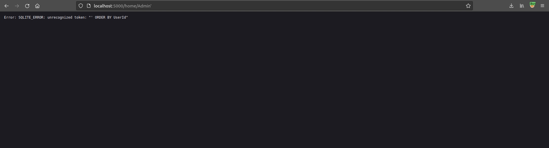http://localhost:5000/home/Admin'By doing so the SQL query syntax is now faulty. This is due to the fact that the user supplied input is being directly concatenated into the SQL query.