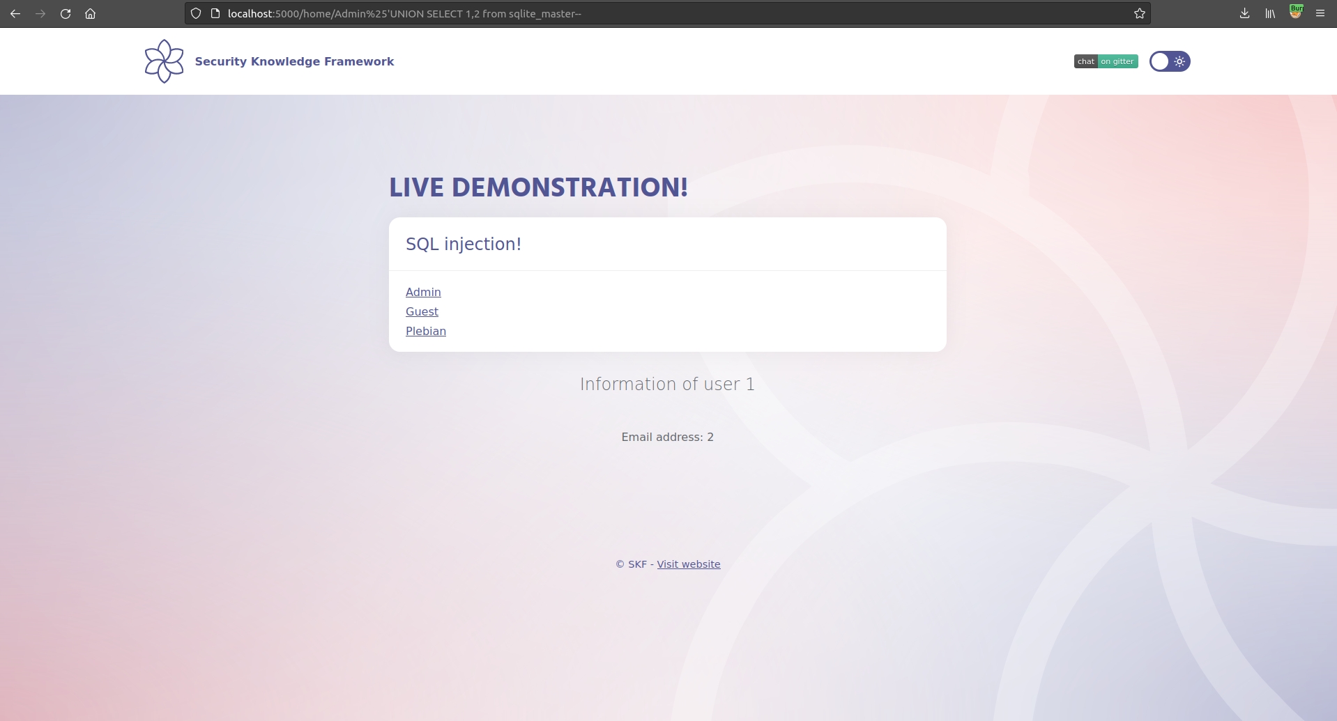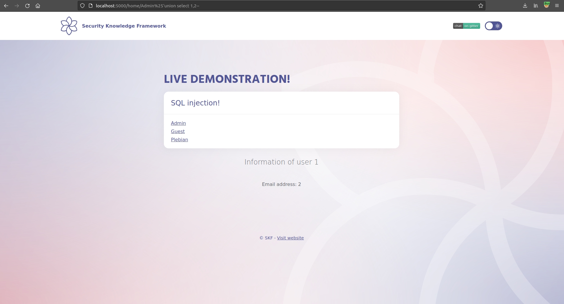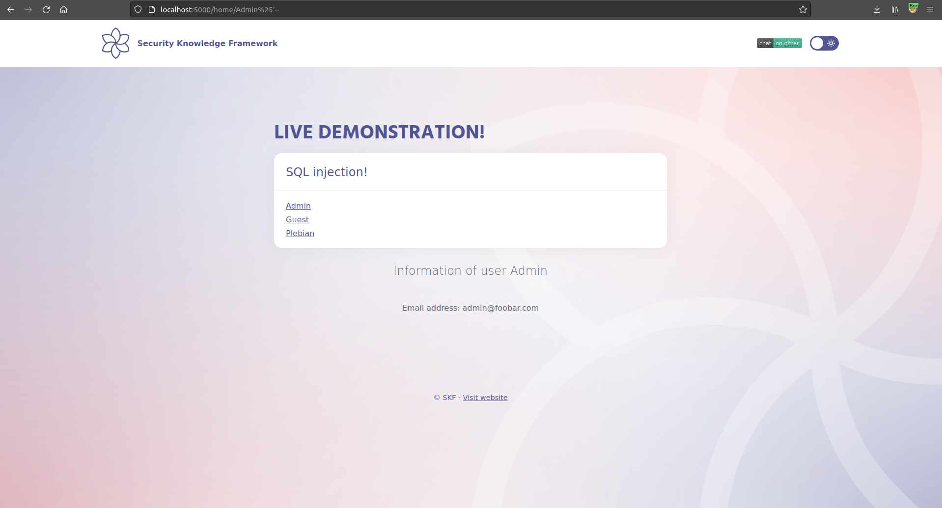 $ sudo docker pull blabla1337/owasp-skf-lab:js-sqli-like$ sudo docker run -ti -p 127.0.0.1:5000:5000 blabla1337/owasp-skf-lab:js-sqli-likeNow that the app is running let's go hacking!