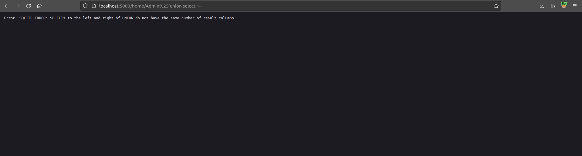 http://localhost:5000/home/Admin%25'union select 1--This query results in an error, this is due to the fact that the original query started with 2 columns namely * UserName * email