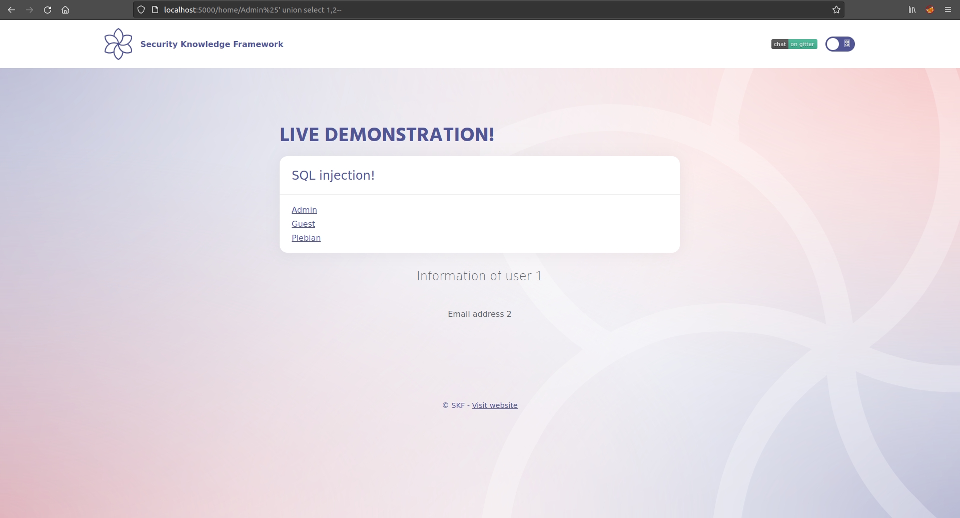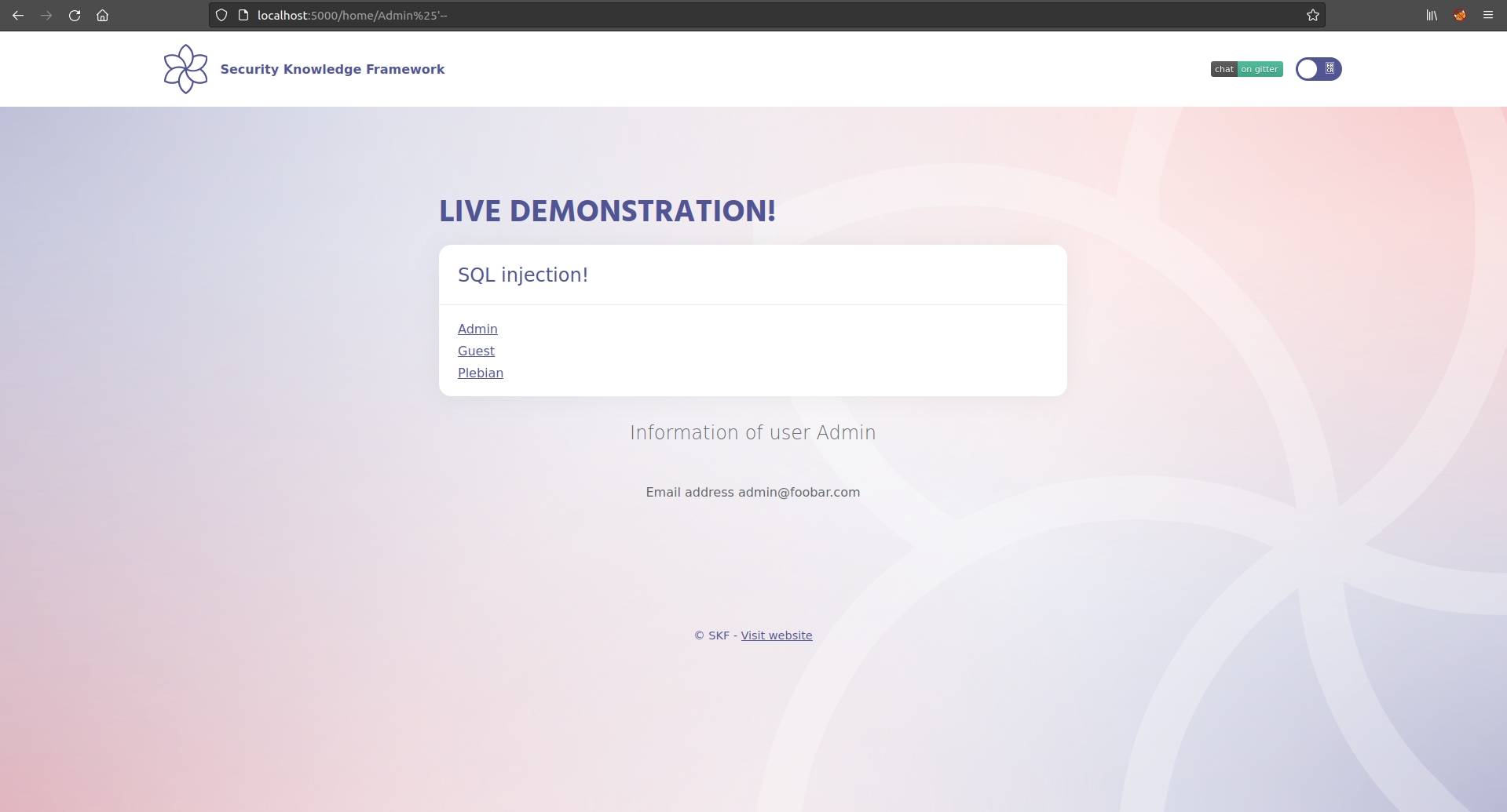 $ sudo docker pull blabla1337/owasp-skf-lab:java-sqli-like$ sudo docker run -ti -p 127.0.0.1:5000:5000 blabla1337/owasp-skf-lab:java-sqli-likeNow that the app is running let's go hacking!