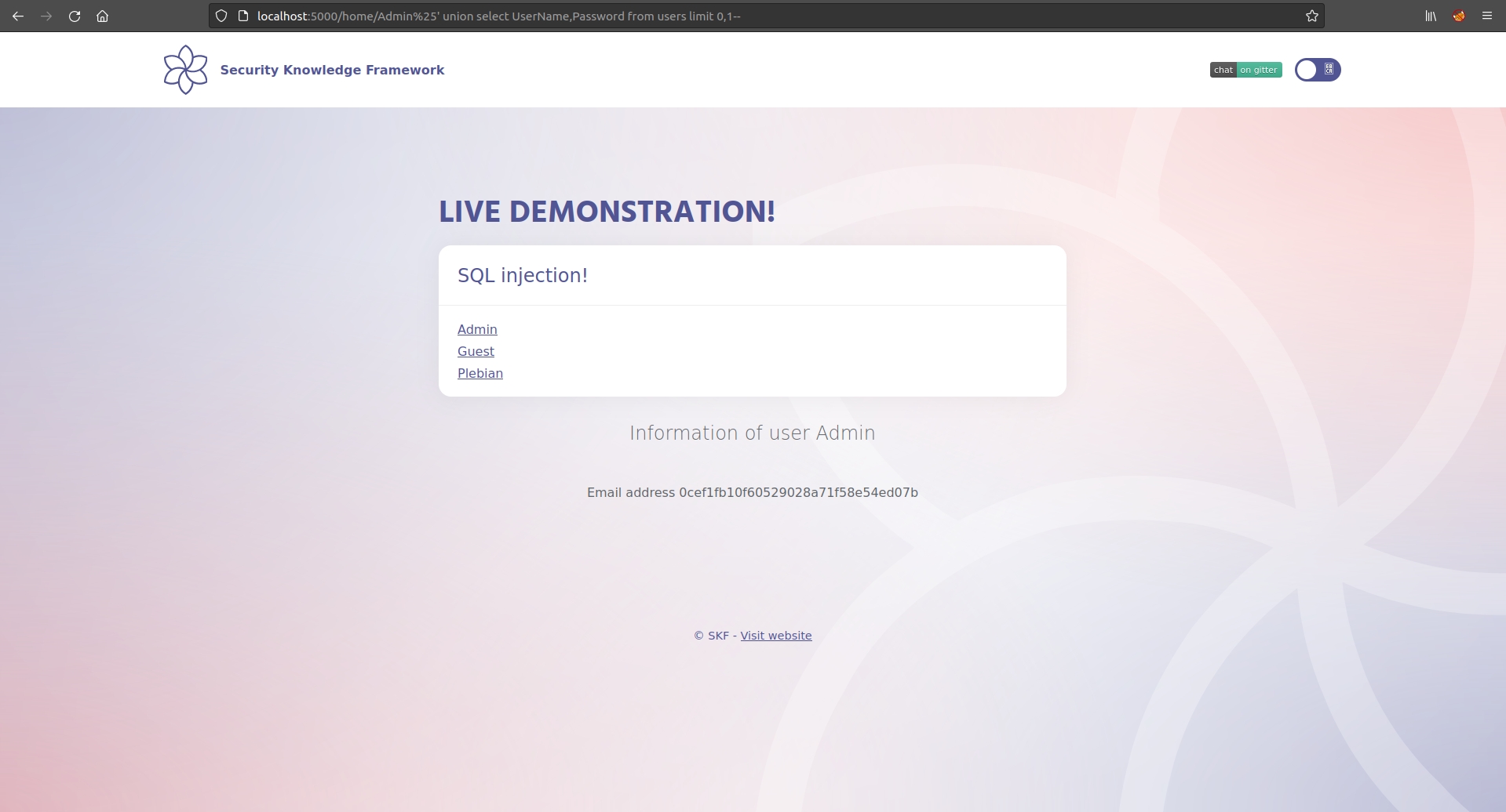 http:////localhost:5000/home/Admin%25'--After that we inject a logical operator which is true (and 1=1). This should result in the application run as intended without errors.