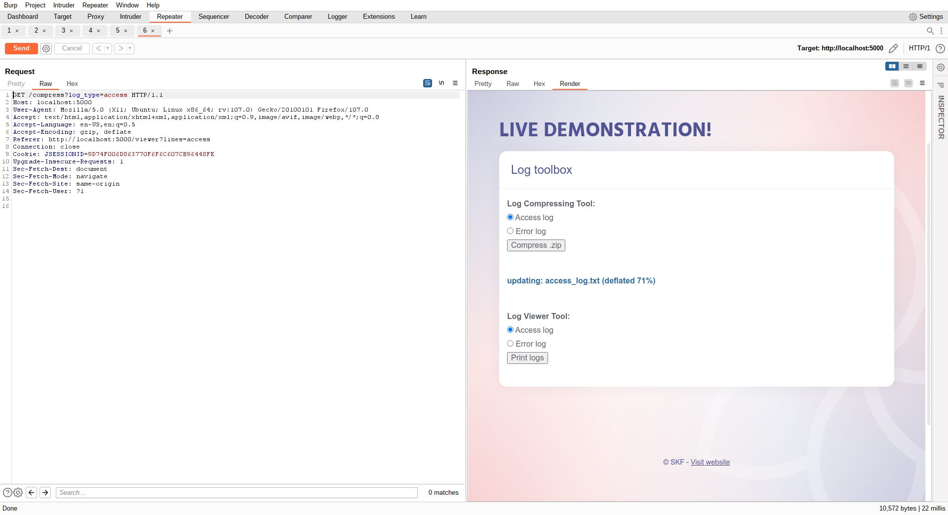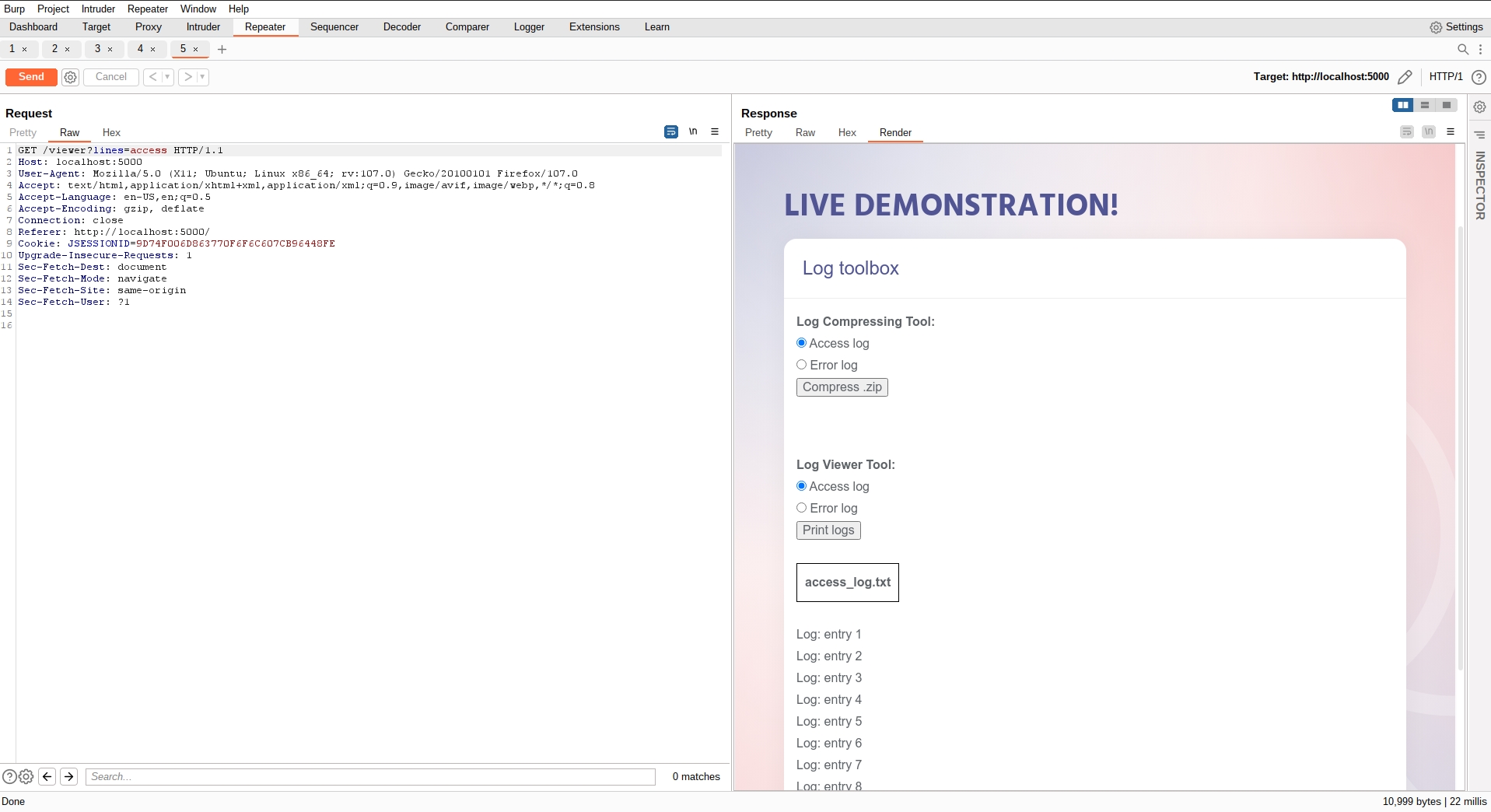 We can capture the login in the burpsuite proxy and send it to the repeater. We notice that with every login, the session cookie stays the same. It is high likely that this sessionid is related to our user name: