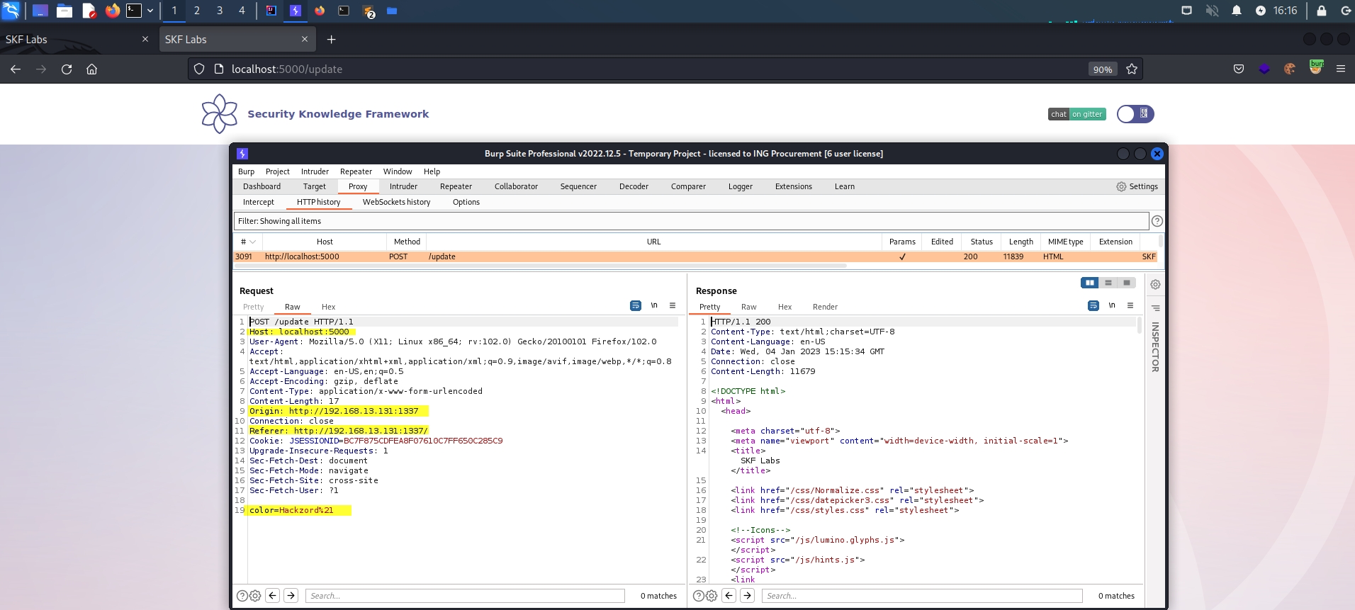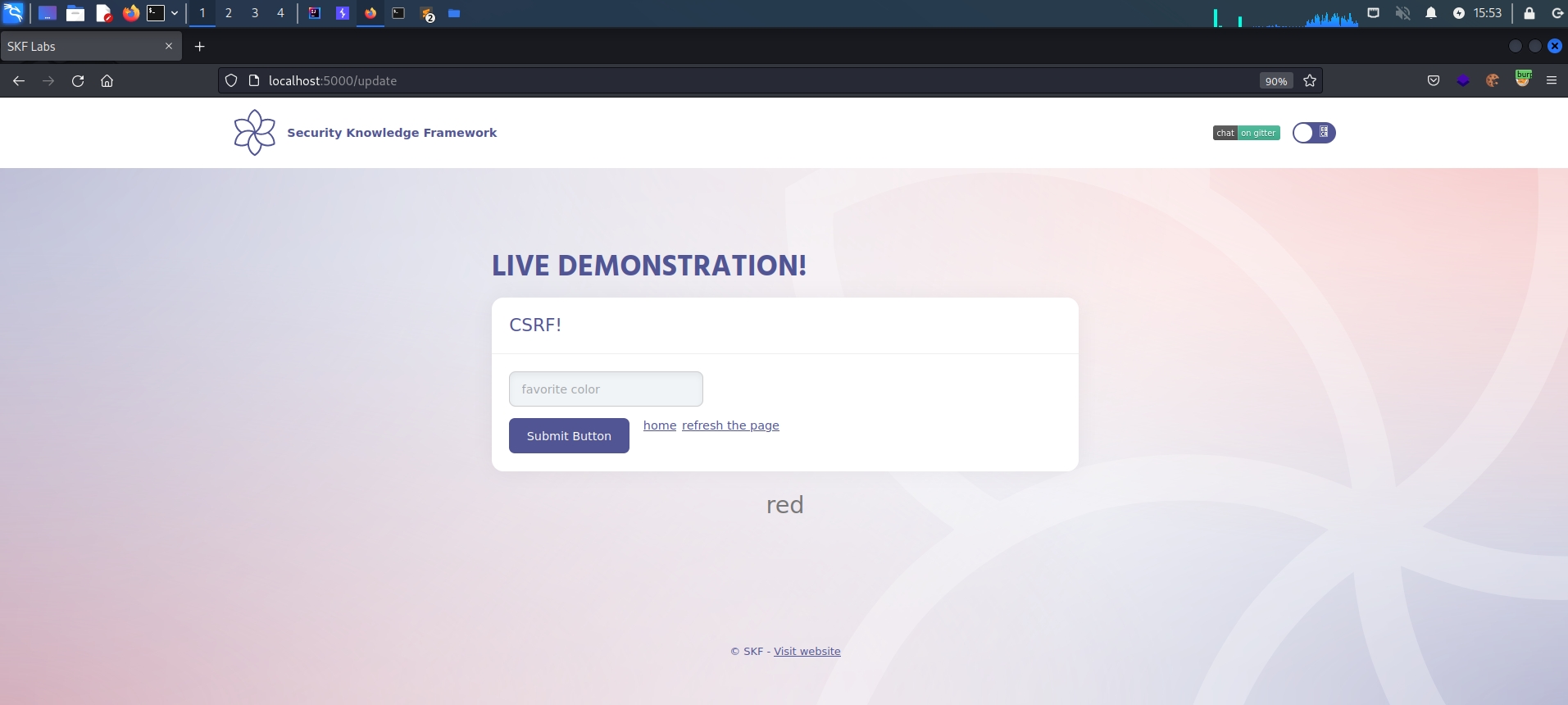 Content-Length: 9822<a href="http://localhost:5000/update?color=Hackzord%21">Try with GET method</a>$ sudo docker pull blabla1337/owasp-skf-lab:java-csrf-weak$ sudo docker run -ti -p 127.0.0.1:5000:5000 blabla1337/owasp-skf-lab:java-csrf-weakusername : admin